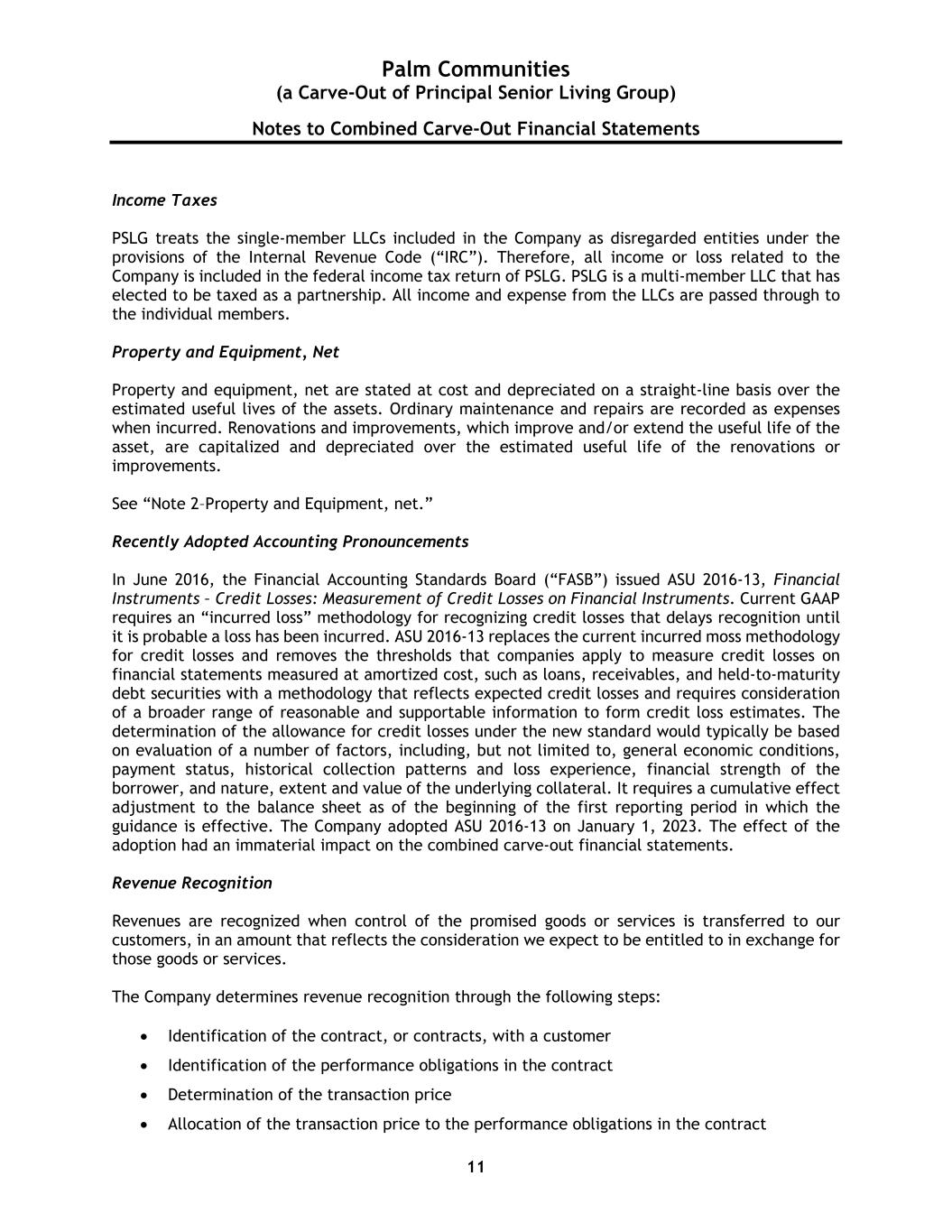 Palm Communities (a Carve-Out of Principal Senior Living Group) Notes to Combined Carve-Out Financial Statements 11 Income Taxes PSLG treats the single-member LLCs included in the Company as disregarded entities under the provisions of the Internal Revenue Code (“IRC”). Therefore, all income or loss related to the Company is included in the federal income tax return of PSLG. PSLG is a multi-member LLC that has elected to be taxed as a partnership. All income and expense from the LLCs are passed through to the individual members. Property and Equipment, Net Property and equipment, net are stated at cost and depreciated on a straight-line basis over the estimated useful lives of the assets. Ordinary maintenance and repairs are recorded as expenses when incurred. Renovations and improvements, which improve and/or extend the useful life of the asset, are capitalized and depreciated over the estimated useful life of the renovations or improvements. See “Note 2–Property and Equipment, net.” Recently Adopted Accounting Pronouncements In June 2016, the Financial Accounting Standards Board (“FASB”) issued ASU 2016-13, Financial Instruments – Credit Losses: Measurement of Credit Losses on Financial Instruments. Current GAAP requires an “incurred loss” methodology for recognizing credit losses that delays recognition until it is probable a loss has been incurred. ASU 2016-13 replaces the current incurred moss methodology for credit losses and removes the thresholds that companies apply to measure credit losses on financial statements measured at amortized cost, such as loans, receivables, and held-to-maturity debt securities with a methodology that reflects expected credit losses and requires consideration of a broader range of reasonable and supportable information to form credit loss estimates. The determination of the allowance for credit losses under the new standard would typically be based on evaluation of a number of factors, including, but not limited to, general economic conditions, payment status, historical collection patterns and loss experience, financial strength of the borrower, and nature, extent and value of the underlying collateral. It requires a cumulative effect adjustment to the balance sheet as of the beginning of the first reporting period in which the guidance is effective. The Company adopted ASU 2016-13 on January 1, 2023. The effect of the adoption had an immaterial impact on the combined carve-out financial statements. Revenue Recognition Revenues are recognized when control of the promised goods or services is transferred to our customers, in an amount that reflects the consideration we expect to be entitled to in exchange for those goods or services. The Company determines revenue recognition through the following steps: • Identification of the contract, or contracts, with a customer • Identification of the performance obligations in the contract • Determination of the transaction price • Allocation of the transaction price to the performance obligations in the contract