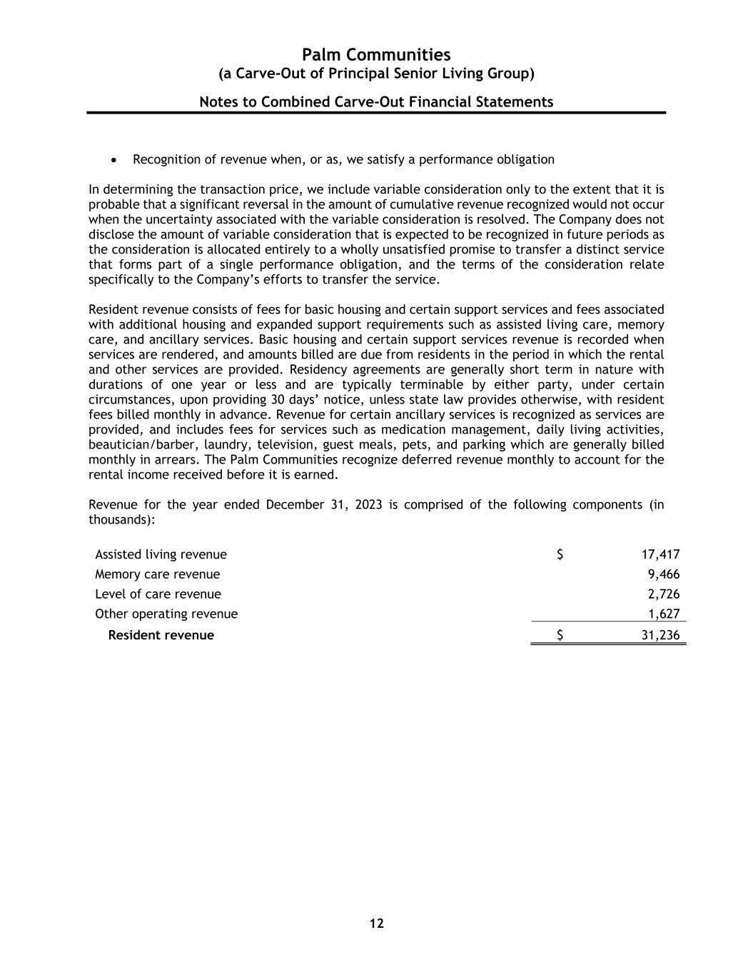 Palm Communities (a Carve-Out of Principal Senior Living Group) Notes to Combined Carve-Out Financial Statements 12 • Recognition of revenue when, or as, we satisfy a performance obligation In determining the transaction price, we include variable consideration only to the extent that it is probable that a significant reversal in the amount of cumulative revenue recognized would not occur when the uncertainty associated with the variable consideration is resolved. The Company does not disclose the amount of variable consideration that is expected to be recognized in future periods as the consideration is allocated entirely to a wholly unsatisfied promise to transfer a distinct service that forms part of a single performance obligation, and the terms of the consideration relate specifically to the Company’s efforts to transfer the service. Resident revenue consists of fees for basic housing and certain support services and fees associated with additional housing and expanded support requirements such as assisted living care, memory care, and ancillary services. Basic housing and certain support services revenue is recorded when services are rendered, and amounts billed are due from residents in the period in which the rental and other services are provided. Residency agreements are generally short term in nature with durations of one year or less and are typically terminable by either party, under certain circumstances, upon providing 30 days’ notice, unless state law provides otherwise, with resident fees billed monthly in advance. Revenue for certain ancillary services is recognized as services are provided, and includes fees for services such as medication management, daily living activities, beautician/barber, laundry, television, guest meals, pets, and parking which are generally billed monthly in arrears. The Palm Communities recognize deferred revenue monthly to account for the rental income received before it is earned. Revenue for the year ended December 31, 2023 is comprised of the following components (in thousands): Assisted living revenue $ 17,417 Memory care revenue 9,466 Level of care revenue 2,726 Other operating revenue 1,627 Resident revenue $ 31,236