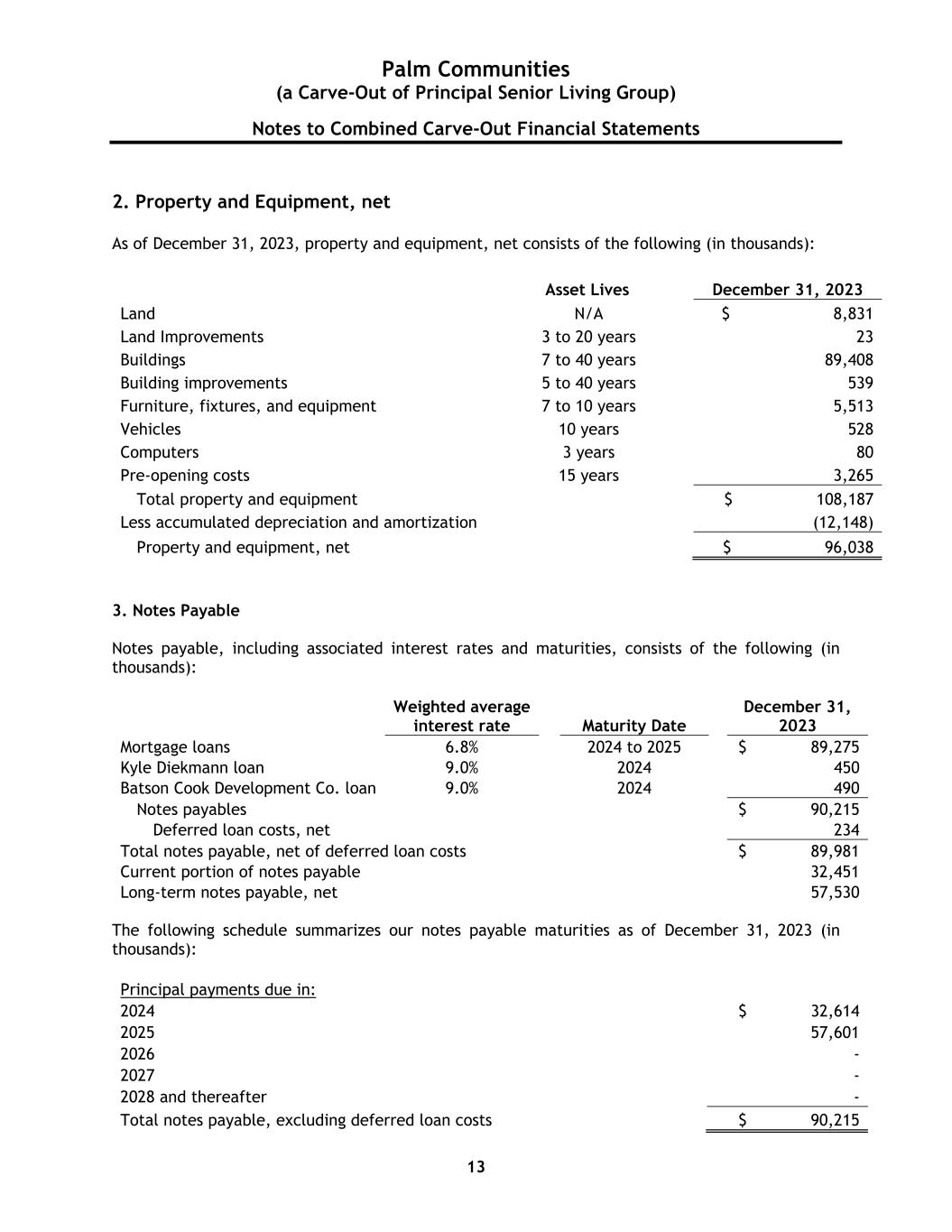 Palm Communities (a Carve-Out of Principal Senior Living Group) Notes to Combined Carve-Out Financial Statements 13 2. Property and Equipment, net As of December 31, 2023, property and equipment, net consists of the following (in thousands): Asset Lives December 31, 2023 Land N/A $ 8,831 Land Improvements 3 to 20 years 23 Buildings 7 to 40 years 89,408 Building improvements 5 to 40 years 539 Furniture, fixtures, and equipment 7 to 10 years 5,513 Vehicles 10 years 528 Computers 3 years 80 Pre-opening costs 15 years 3,265 Total property and equipment $ 108,187 Less accumulated depreciation and amortization (12,148) Property and equipment, net $ 96,038 3. Notes Payable Notes payable, including associated interest rates and maturities, consists of the following (in thousands): Weighted average interest rate Maturity Date December 31, 2023 Mortgage loans 6.8% 2024 to 2025 $ 89,275 Kyle Diekmann loan 9.0% 2024 450 Batson Cook Development Co. loan 9.0% 2024 490 Notes payables $ 90,215 Deferred loan costs, net 234 Total notes payable, net of deferred loan costs $ 89,981 Current portion of notes payable 32,451 Long-term notes payable, net 57,530 The following schedule summarizes our notes payable maturities as of December 31, 2023 (in thousands): Principal payments due in: 2024 $ 32,614 2025 57,601 2026 - 2027 - 2028 and thereafter - Total notes payable, excluding deferred loan costs $ 90,215