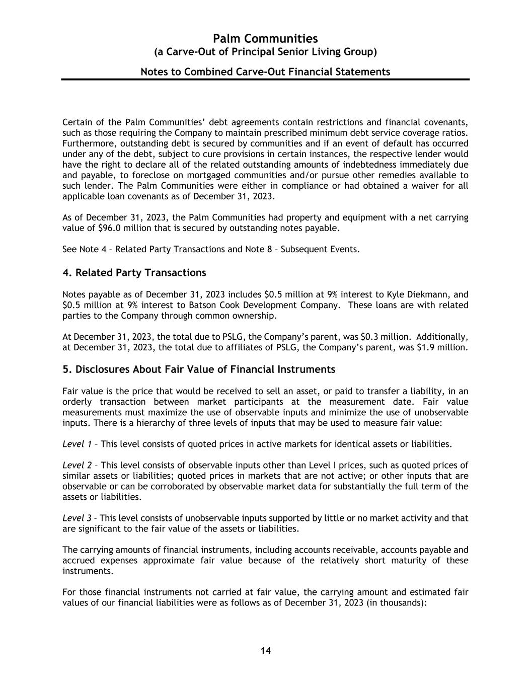 Palm Communities (a Carve-Out of Principal Senior Living Group) Notes to Combined Carve-Out Financial Statements 14 Certain of the Palm Communities’ debt agreements contain restrictions and financial covenants, such as those requiring the Company to maintain prescribed minimum debt service coverage ratios. Furthermore, outstanding debt is secured by communities and if an event of default has occurred under any of the debt, subject to cure provisions in certain instances, the respective lender would have the right to declare all of the related outstanding amounts of indebtedness immediately due and payable, to foreclose on mortgaged communities and/or pursue other remedies available to such lender. The Palm Communities were either in compliance or had obtained a waiver for all applicable loan covenants as of December 31, 2023. As of December 31, 2023, the Palm Communities had property and equipment with a net carrying value of $96.0 million that is secured by outstanding notes payable. See Note 4 – Related Party Transactions and Note 8 – Subsequent Events. 4. Related Party Transactions Notes payable as of December 31, 2023 includes $0.5 million at 9% interest to Kyle Diekmann, and $0.5 million at 9% interest to Batson Cook Development Company. These loans are with related parties to the Company through common ownership. At December 31, 2023, the total due to PSLG, the Company’s parent, was $0.3 million. Additionally, at December 31, 2023, the total due to affiliates of PSLG, the Company’s parent, was $1.9 million. 5. Disclosures About Fair Value of Financial Instruments Fair value is the price that would be received to sell an asset, or paid to transfer a liability, in an orderly transaction between market participants at the measurement date. Fair value measurements must maximize the use of observable inputs and minimize the use of unobservable inputs. There is a hierarchy of three levels of inputs that may be used to measure fair value: Level 1 – This level consists of quoted prices in active markets for identical assets or liabilities. Level 2 – This level consists of observable inputs other than Level I prices, such as quoted prices of similar assets or liabilities; quoted prices in markets that are not active; or other inputs that are observable or can be corroborated by observable market data for substantially the full term of the assets or liabilities. Level 3 – This level consists of unobservable inputs supported by little or no market activity and that are significant to the fair value of the assets or liabilities. The carrying amounts of financial instruments, including accounts receivable, accounts payable and accrued expenses approximate fair value because of the relatively short maturity of these instruments. For those financial instruments not carried at fair value, the carrying amount and estimated fair values of our financial liabilities were as follows as of December 31, 2023 (in thousands):