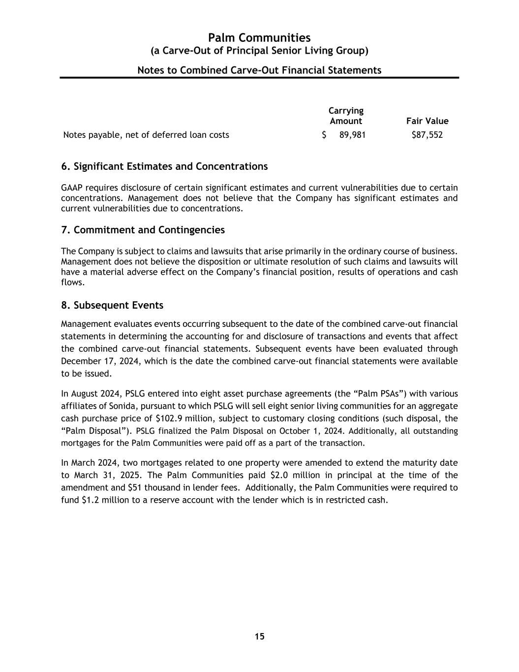 Palm Communities (a Carve-Out of Principal Senior Living Group) Notes to Combined Carve-Out Financial Statements 15 Carrying Amount Fair Value Notes payable, net of deferred loan costs $ 89,981 $87,552 6. Significant Estimates and Concentrations GAAP requires disclosure of certain significant estimates and current vulnerabilities due to certain concentrations. Management does not believe that the Company has significant estimates and current vulnerabilities due to concentrations. 7. Commitment and Contingencies The Company is subject to claims and lawsuits that arise primarily in the ordinary course of business. Management does not believe the disposition or ultimate resolution of such claims and lawsuits will have a material adverse effect on the Company’s financial position, results of operations and cash flows. 8. Subsequent Events Management evaluates events occurring subsequent to the date of the combined carve-out financial statements in determining the accounting for and disclosure of transactions and events that affect the combined carve-out financial statements. Subsequent events have been evaluated through December 17, 2024, which is the date the combined carve-out financial statements were available to be issued. In August 2024, PSLG entered into eight asset purchase agreements (the “Palm PSAs”) with various affiliates of Sonida, pursuant to which PSLG will sell eight senior living communities for an aggregate cash purchase price of $102.9 million, subject to customary closing conditions (such disposal, the “Palm Disposal”). PSLG finalized the Palm Disposal on October 1, 2024. Additionally, all outstanding mortgages for the Palm Communities were paid off as a part of the transaction. In March 2024, two mortgages related to one property were amended to extend the maturity date to March 31, 2025. The Palm Communities paid $2.0 million in principal at the time of the amendment and $51 thousand in lender fees. Additionally, the Palm Communities were required to fund $1.2 million to a reserve account with the lender which is in restricted cash.