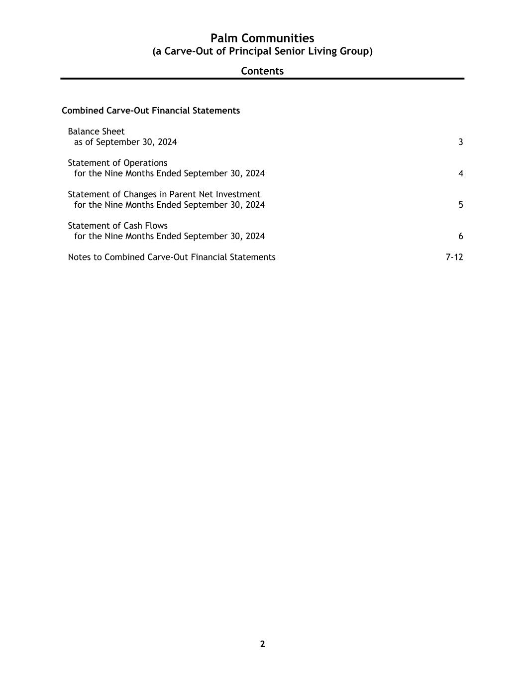 Palm Communities (a Carve-Out of Principal Senior Living Group) Contents 2 Combined Carve-Out Financial Statements Balance Sheet as of September 30, 2024 3 Statement of Operations for the Nine Months Ended September 30, 2024 4 Statement of Changes in Parent Net Investment for the Nine Months Ended September 30, 2024 5 Statement of Cash Flows for the Nine Months Ended September 30, 2024 6 Notes to Combined Carve-Out Financial Statements 7-12