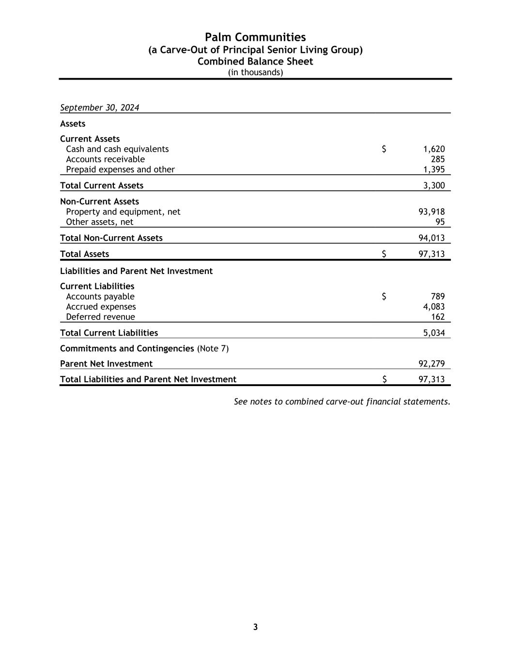 Palm Communities (a Carve-Out of Principal Senior Living Group) Combined Balance Sheet (in thousands) 3 September 30, 2024 Assets Current Assets Cash and cash equivalents $ 1,620 Accounts receivable 285 Prepaid expenses and other 1,395 Total Current Assets 3,300 Non-Current Assets Property and equipment, net 93,918 Other assets, net 95 Total Non-Current Assets 94,013 Total Assets $ 97,313 Liabilities and Parent Net Investment Current Liabilities Accounts payable $ 789 Accrued expenses 4,083 Deferred revenue 162 Total Current Liabilities 5,034 Commitments and Contingencies (Note 7) Parent Net Investment 92,279 Total Liabilities and Parent Net Investment $ 97,313 See notes to combined carve-out financial statements.