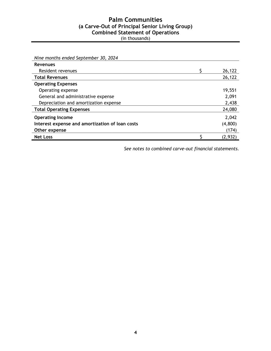 Palm Communities (a Carve-Out of Principal Senior Living Group) Combined Statement of Operations (in thousands) 4 Nine months ended September 30, 2024 Revenues Resident revenues $ 26,122 Total Revenues 26,122 Operating Expenses Operating expense 19,551 General and administrative expense 2,091 Depreciation and amortization expense 2,438 Total Operating Expenses 24,080 Operating Income 2,042 Interest expense and amortization of loan costs (4,800) Other expense (174) Net Loss $ (2,932) See notes to combined carve-out financial statements.
