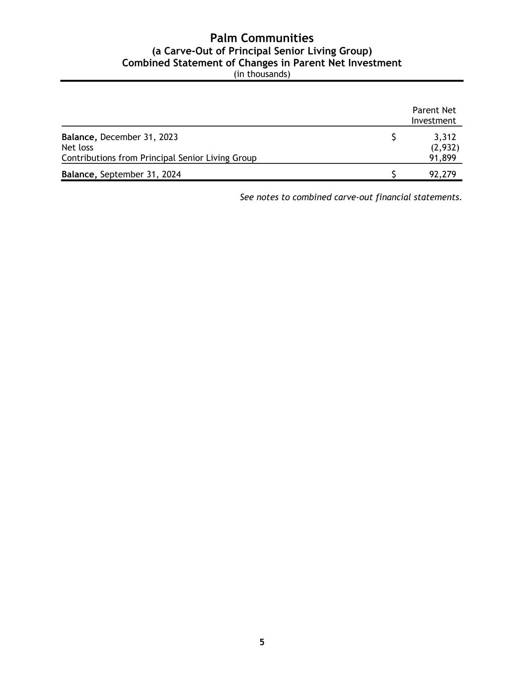 Palm Communities (a Carve-Out of Principal Senior Living Group) Combined Statement of Changes in Parent Net Investment (in thousands) 5 Parent Net Investment Balance, December 31, 2023 $ 3,312 Net loss (2,932) Contributions from Principal Senior Living Group 91,899 Balance, September 31, 2024 $ 92,279 See notes to combined carve-out financial statements.