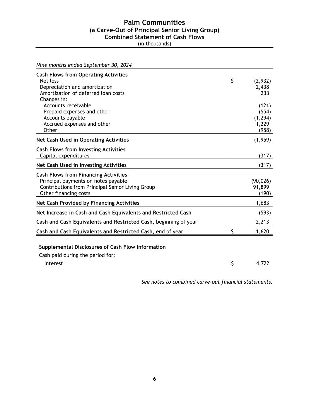 Palm Communities (a Carve-Out of Principal Senior Living Group) Combined Statement of Cash Flows (in thousands) 6 Nine months ended September 30, 2024 Cash Flows from Operating Activities Net loss $ (2,932) Depreciation and amortization 2,438 Amortization of deferred loan costs 233 Changes in: Accounts receivable (121) Prepaid expenses and other (554) Accounts payable (1,294) Accrued expenses and other 1,229 Other (958) Net Cash Used in Operating Activities (1,959) Cash Flows from Investing Activities Capital expenditures (317) Net Cash Used in Investing Activities (317) Cash Flows from Financing Activities Principal payments on notes payable (90,026) Contributions from Principal Senior Living Group 91,899 Other financing costs (190) Net Cash Provided by Financing Activities 1,683 Net Increase in Cash and Cash Equivalents and Restricted Cash (593) Cash and Cash Equivalents and Restricted Cash, beginning of year 2,213 Cash and Cash Equivalents and Restricted Cash, end of year $ 1,620 Supplemental Disclosures of Cash Flow Information Cash paid during the period for: Interest $ 4,722 See notes to combined carve-out financial statements.
