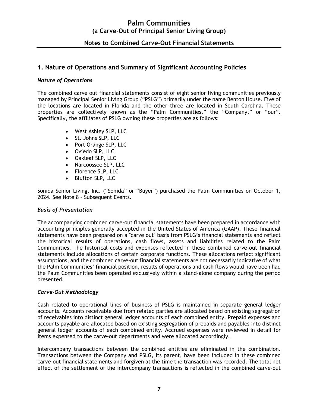 Palm Communities (a Carve-Out of Principal Senior Living Group) Notes to Combined Carve-Out Financial Statements 7 1. Nature of Operations and Summary of Significant Accounting Policies Nature of Operations The combined carve out financial statements consist of eight senior living communities previously managed by Principal Senior Living Group (“PSLG”) primarily under the name Benton House. Five of the locations are located in Florida and the other three are located in South Carolina. These properties are collectively known as the “Palm Communities,” the “Company,” or “our”. Specifically, the affiliates of PSLG owning these properties are as follows: • West Ashley SLP, LLC • St. Johns SLP, LLC • Port Orange SLP, LLC • Oviedo SLP, LLC • Oakleaf SLP, LLC • Narcoossee SLP, LLC • Florence SLP, LLC • Blufton SLP, LLC Sonida Senior Living, Inc. (“Sonida” or “Buyer”) purchased the Palm Communities on October 1, 2024. See Note 8 – Subsequent Events. Basis of Presentation The accompanying combined carve-out financial statements have been prepared in accordance with accounting principles generally accepted in the United States of America (GAAP). These financial statements have been prepared on a "carve out" basis from PSLG’s financial statements and reflect the historical results of operations, cash flows, assets and liabilities related to the Palm Communities. The historical costs and expenses reflected in these combined carve-out financial statements include allocations of certain corporate functions. These allocations reflect significant assumptions, and the combined carve-out financial statements are not necessarily indicative of what the Palm Communities’ financial position, results of operations and cash flows would have been had the Palm Communities been operated exclusively within a stand-alone company during the period presented. Carve-Out Methodology Cash related to operational lines of business of PSLG is maintained in separate general ledger accounts. Accounts receivable due from related parties are allocated based on existing segregation of receivables into distinct general ledger accounts of each combined entity. Prepaid expenses and accounts payable are allocated based on existing segregation of prepaids and payables into distinct general ledger accounts of each combined entity. Accrued expenses were reviewed in detail for items expensed to the carve-out departments and were allocated accordingly. Intercompany transactions between the combined entities are eliminated in the combination. Transactions between the Company and PSLG, its parent, have been included in these combined carve-out financial statements and forgiven at the time the transaction was recorded. The total net effect of the settlement of the intercompany transactions is reflected in the combined carve-out