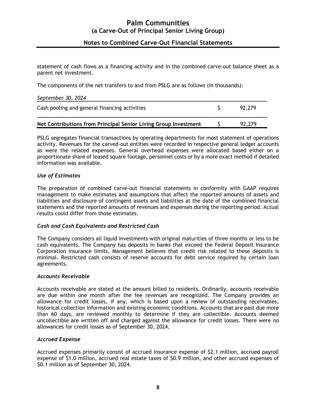Palm Communities (a Carve-Out of Principal Senior Living Group) Notes to Combined Carve-Out Financial Statements 8 statement of cash flows as a financing activity and in the combined carve-out balance sheet as a parent net investment. The components of the net transfers to and from PSLG are as follows (in thousands): September 30, 2024 Cash pooling and general financing activities $ 92,279 Net Contributions from Principal Senior Living Group Investment $ 92,279 PSLG segregates financial transactions by operating departments for most statement of operations activity. Revenues for the carved-out entities were recorded in respective general ledger accounts as were the related expenses. General overhead expenses were allocated based either on a proportionate share of leased square footage, personnel costs or by a more exact method if detailed information was available. Use of Estimates The preparation of combined carve-out financial statements in conformity with GAAP requires management to make estimates and assumptions that affect the reported amounts of assets and liabilities and disclosure of contingent assets and liabilities at the date of the combined financial statements and the reported amounts of revenues and expenses during the reporting period. Actual results could differ from those estimates. Cash and Cash Equivalents and Restricted Cash The Company considers all liquid investments with original maturities of three months or less to be cash equivalents. The Company has deposits in banks that exceed the Federal Deposit Insurance Corporation insurance limits. Management believes that credit risk related to these deposits is minimal. Restricted cash consists of reserve accounts for debt service required by certain loan agreements. Accounts Receivable Accounts receivable are stated at the amount billed to residents. Ordinarily, accounts receivable are due within one month after the fee revenues are recognized. The Company provides an allowance for credit losses, if any, which is based upon a review of outstanding receivables, historical collection information and existing economic conditions. Accounts that are past due more than 60 days, are reviewed monthly to determine if they are collectible. Accounts deemed uncollectible are written off and charged against the allowance for credit losses. There were no allowances for credit losses as of September 30, 2024. Accrued Expense Accrued expenses primarily consist of accrued insurance expense of $2.1 million, accrued payroll expense of $1.0 million, accrued real estate taxes of $0.9 million, and other accrued expenses of $0.1 million as of September 30, 2024.