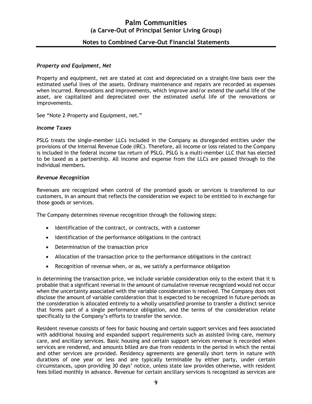Palm Communities (a Carve-Out of Principal Senior Living Group) Notes to Combined Carve-Out Financial Statements 9 Property and Equipment, Net Property and equipment, net are stated at cost and depreciated on a straight-line basis over the estimated useful lives of the assets. Ordinary maintenance and repairs are recorded as expenses when incurred. Renovations and improvements, which improve and/or extend the useful life of the asset, are capitalized and depreciated over the estimated useful life of the renovations or improvements. See “Note 2–Property and Equipment, net.” Income Taxes PSLG treats the single-member LLCs included in the Company as disregarded entities under the provisions of the Internal Revenue Code (IRC). Therefore, all income or loss related to the Company is included in the federal income tax return of PSLG. PSLG is a multi-member LLC that has elected to be taxed as a partnership. All income and expense from the LLCs are passed through to the individual members. Revenue Recognition Revenues are recognized when control of the promised goods or services is transferred to our customers, in an amount that reflects the consideration we expect to be entitled to in exchange for those goods or services. The Company determines revenue recognition through the following steps: • Identification of the contract, or contracts, with a customer • Identification of the performance obligations in the contract • Determination of the transaction price • Allocation of the transaction price to the performance obligations in the contract • Recognition of revenue when, or as, we satisfy a performance obligation In determining the transaction price, we include variable consideration only to the extent that it is probable that a significant reversal in the amount of cumulative revenue recognized would not occur when the uncertainty associated with the variable consideration is resolved. The Company does not disclose the amount of variable consideration that is expected to be recognized in future periods as the consideration is allocated entirely to a wholly unsatisfied promise to transfer a distinct service that forms part of a single performance obligation, and the terms of the consideration relate specifically to the Company’s efforts to transfer the service. Resident revenue consists of fees for basic housing and certain support services and fees associated with additional housing and expanded support requirements such as assisted living care, memory care, and ancillary services. Basic housing and certain support services revenue is recorded when services are rendered, and amounts billed are due from residents in the period in which the rental and other services are provided. Residency agreements are generally short term in nature with durations of one year or less and are typically terminable by either party, under certain circumstances, upon providing 30 days’ notice, unless state law provides otherwise, with resident fees billed monthly in advance. Revenue for certain ancillary services is recognized as services are