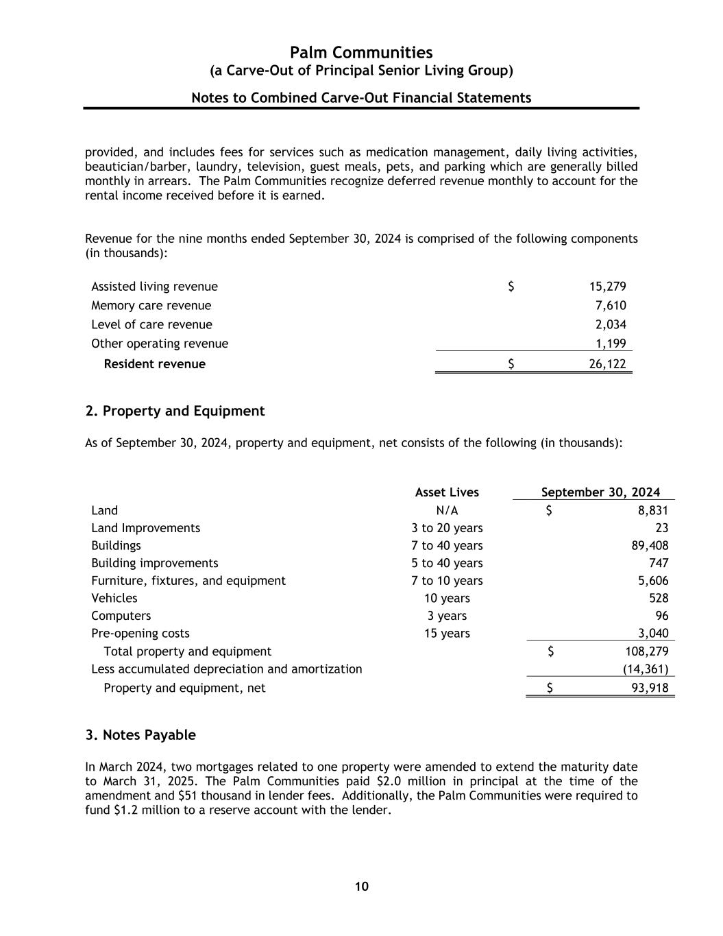 Palm Communities (a Carve-Out of Principal Senior Living Group) Notes to Combined Carve-Out Financial Statements 10 provided, and includes fees for services such as medication management, daily living activities, beautician/barber, laundry, television, guest meals, pets, and parking which are generally billed monthly in arrears. The Palm Communities recognize deferred revenue monthly to account for the rental income received before it is earned. Revenue for the nine months ended September 30, 2024 is comprised of the following components (in thousands): Assisted living revenue $ 15,279 Memory care revenue 7,610 Level of care revenue 2,034 Other operating revenue 1,199 Resident revenue $ 26,122 2. Property and Equipment As of September 30, 2024, property and equipment, net consists of the following (in thousands): Asset Lives September 30, 2024 Land N/A $ 8,831 Land Improvements 3 to 20 years 23 Buildings 7 to 40 years 89,408 Building improvements 5 to 40 years 747 Furniture, fixtures, and equipment 7 to 10 years 5,606 Vehicles 10 years 528 Computers 3 years 96 Pre-opening costs 15 years 3,040 Total property and equipment $ 108,279 Less accumulated depreciation and amortization (14,361) Property and equipment, net $ 93,918 3. Notes Payable In March 2024, two mortgages related to one property were amended to extend the maturity date to March 31, 2025. The Palm Communities paid $2.0 million in principal at the time of the amendment and $51 thousand in lender fees. Additionally, the Palm Communities were required to fund $1.2 million to a reserve account with the lender.