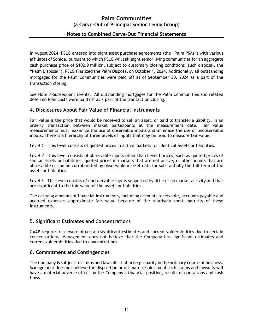 Palm Communities (a Carve-Out of Principal Senior Living Group) Notes to Combined Carve-Out Financial Statements 11 In August 2024, PSLG entered into eight asset purchase agreements (the “Palm PSAs”) with various affiliates of Sonida, pursuant to which PSLG will sell eight senior living communities for an aggregate cash purchase price of $102.9 million, subject to customary closing conditions (such disposal, the “Palm Disposal”). PSLG finalized the Palm Disposal on October 1, 2024. Additionally, all outstanding mortgages for the Palm Communities were paid off as of September 30, 2024 as a part of the transaction closing. See Note 7-Subsequent Events. All outstanding mortgages for the Palm Communities and related deferred loan costs were paid off as a part of the transaction closing. 4. Disclosures About Fair Value of Financial Instruments Fair value is the price that would be received to sell an asset, or paid to transfer a liability, in an orderly transaction between market participants at the measurement date. Fair value measurements must maximize the use of observable inputs and minimize the use of unobservable inputs. There is a hierarchy of three levels of inputs that may be used to measure fair value: Level 1 – This level consists of quoted prices in active markets for identical assets or liabilities. Level 2 – This level consists of observable inputs other than Level I prices, such as quoted prices of similar assets or liabilities; quoted prices in markets that are not active; or other inputs that are observable or can be corroborated by observable market data for substantially the full term of the assets or liabilities. Level 3 – This level consists of unobservable inputs supported by little or no market activity and that are significant to the fair value of the assets or liabilities. The carrying amounts of financial instruments, including accounts receivable, accounts payable and accrued expenses approximate fair value because of the relatively short maturity of these instruments. 5. Significant Estimates and Concentrations GAAP requires disclosure of certain significant estimates and current vulnerabilities due to certain concentrations. Management does not believe that the Company has significant estimates and current vulnerabilities due to concentrations. 6. Commitment and Contingencies The Company is subject to claims and lawsuits that arise primarily in the ordinary course of business. Management does not believe the disposition or ultimate resolution of such claims and lawsuits will have a material adverse effect on the Company’s financial position, results of operations and cash flows.