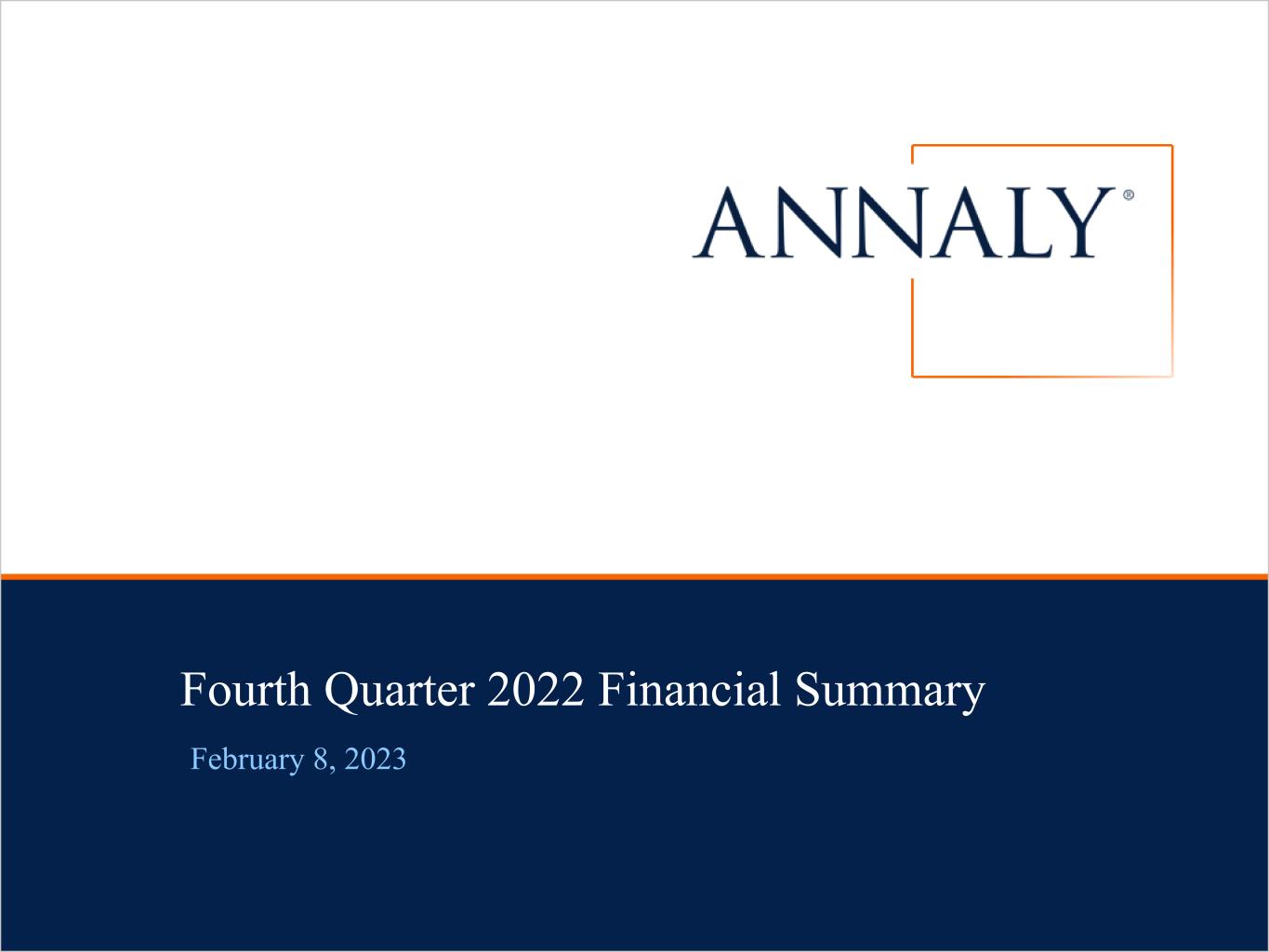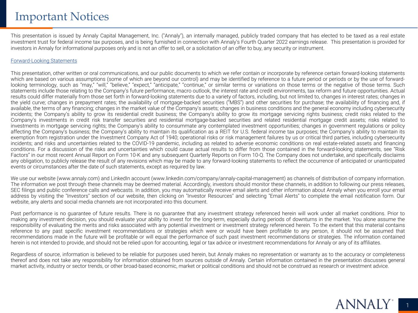 This presentation is issued by Annaly Capital Management, Inc. ("Annaly"), an internally managed, publicly traded company that has elected to be taxed as a real estate investment trust for federal income tax purposes, and is being furnished in connection with Annaly’s Fourth Quarter 2022 earnings release. This presentation is provided for investors in Annaly for informational purposes only and is not an offer to sell, or a solicitation of an offer to buy, any security or instrument. Forward-Looking Statements This presentation, other written or oral communications, and our public documents to which we refer contain or incorporate by reference certain forward-looking statements which are based on various assumptions (some of which are beyond our control) and may be identified by reference to a future period or periods or by the use of forward- looking terminology, such as “may,” “will,” “believe,” “expect,” “anticipate,” “continue,” or similar terms or variations on those terms or the negative of those terms. Such statements include those relating to the Company’s future performance, macro outlook, the interest rate and credit environments, tax reform and future opportunities. Actual results could differ materially from those set forth in forward-looking statements due to a variety of factors, including, but not limited to, changes in interest rates; changes in the yield curve; changes in prepayment rates; the availability of mortgage-backed securities (“MBS”) and other securities for purchase; the availability of financing and, if available, the terms of any financing; changes in the market value of the Company’s assets; changes in business conditions and the general economy including cybersecurity incidents; the Company’s ability to grow its residential credit business; the Company's ability to grow its mortgage servicing rights business; credit risks related to the Company’s investments in credit risk transfer securities and residential mortgage-backed securities and related residential mortgage credit assets; risks related to investments in mortgage servicing rights; the Company’s ability to consummate any contemplated investment opportunities; changes in government regulations or policy affecting the Company’s business; the Company’s ability to maintain its qualification as a REIT for U.S. federal income tax purposes; the Company’s ability to maintain its exemption from registration under the Investment Company Act of 1940; operational risks or risk management failures by us or critical third parties, including cybersecurity incidents; and risks and uncertainties related to the COVID-19 pandemic, including as related to adverse economic conditions on real estate-related assets and financing conditions. For a discussion of the risks and uncertainties which could cause actual results to differ from those contained in the forward-looking statements, see “Risk Factors” in our most recent Annual Report on Form 10-K and any subsequent Quarterly Reports on Form 10-Q. The Company does not undertake, and specifically disclaims any obligation, to publicly release the result of any revisions which may be made to any forward-looking statements to reflect the occurrence of anticipated or unanticipated events or circumstances after the date of such statements, except as required by law. We use our website (www.annaly.com) and LinkedIn account (www.linkedin.com/company/annaly-capital-management) as channels of distribution of company information. The information we post through these channels may be deemed material. Accordingly, investors should monitor these channels, in addition to following our press releases, SEC filings and public conference calls and webcasts. In addition, you may automatically receive email alerts and other information about Annaly when you enroll your email address by visiting the "Investors" section of our website, then clicking on "Investor Resources" and selecting "Email Alerts" to complete the email notification form. Our website, any alerts and social media channels are not incorporated into this document. Past performance is no guarantee of future results. There is no guarantee that any investment strategy referenced herein will work under all market conditions. Prior to making any investment decision, you should evaluate your ability to invest for the long-term, especially during periods of downturns in the market. You alone assume the responsibility of evaluating the merits and risks associated with any potential investment or investment strategy referenced herein. To the extent that this material contains reference to any past specific investment recommendations or strategies which were or would have been profitable to any person, it should not be assumed that recommendations made in the future will be profitable or will equal the performance of such past investment recommendations or strategies. The information contained herein is not intended to provide, and should not be relied upon for accounting, legal or tax advice or investment recommendations for Annaly or any of its affiliates. Regardless of source, information is believed to be reliable for purposes used herein, but Annaly makes no representation or warranty as to the accuracy or completeness thereof and does not take any responsibility for information obtained from sources outside of Annaly. Certain information contained in the presentation discusses general market activity, industry or sector trends, or other broad-based economic, market or political conditions and should not be construed as research or investment advice. 1 Important Notices