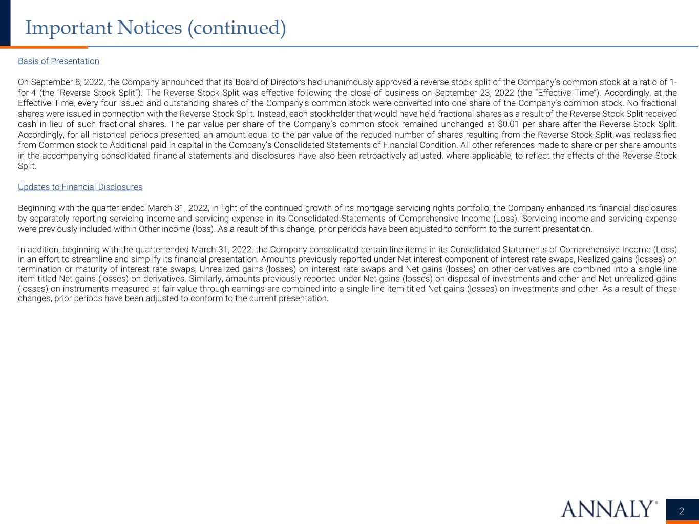 Basis of Presentation On September 8, 2022, the Company announced that its Board of Directors had unanimously approved a reverse stock split of the Company’s common stock at a ratio of 1- for-4 (the “Reverse Stock Split”). The Reverse Stock Split was effective following the close of business on September 23, 2022 (the “Effective Time”). Accordingly, at the Effective Time, every four issued and outstanding shares of the Company’s common stock were converted into one share of the Company’s common stock. No fractional shares were issued in connection with the Reverse Stock Split. Instead, each stockholder that would have held fractional shares as a result of the Reverse Stock Split received cash in lieu of such fractional shares. The par value per share of the Company’s common stock remained unchanged at $0.01 per share after the Reverse Stock Split. Accordingly, for all historical periods presented, an amount equal to the par value of the reduced number of shares resulting from the Reverse Stock Split was reclassified from Common stock to Additional paid in capital in the Company’s Consolidated Statements of Financial Condition. All other references made to share or per share amounts in the accompanying consolidated financial statements and disclosures have also been retroactively adjusted, where applicable, to reflect the effects of the Reverse Stock Split. Updates to Financial Disclosures Beginning with the quarter ended March 31, 2022, in light of the continued growth of its mortgage servicing rights portfolio, the Company enhanced its financial disclosures by separately reporting servicing income and servicing expense in its Consolidated Statements of Comprehensive Income (Loss). Servicing income and servicing expense were previously included within Other income (loss). As a result of this change, prior periods have been adjusted to conform to the current presentation. In addition, beginning with the quarter ended March 31, 2022, the Company consolidated certain line items in its Consolidated Statements of Comprehensive Income (Loss) in an effort to streamline and simplify its financial presentation. Amounts previously reported under Net interest component of interest rate swaps, Realized gains (losses) on termination or maturity of interest rate swaps, Unrealized gains (losses) on interest rate swaps and Net gains (losses) on other derivatives are combined into a single line item titled Net gains (losses) on derivatives. Similarly, amounts previously reported under Net gains (losses) on disposal of investments and other and Net unrealized gains (losses) on instruments measured at fair value through earnings are combined into a single line item titled Net gains (losses) on investments and other. As a result of these changes, prior periods have been adjusted to conform to the current presentation. 2 Important Notices (continued)