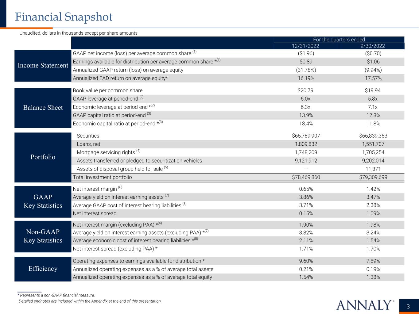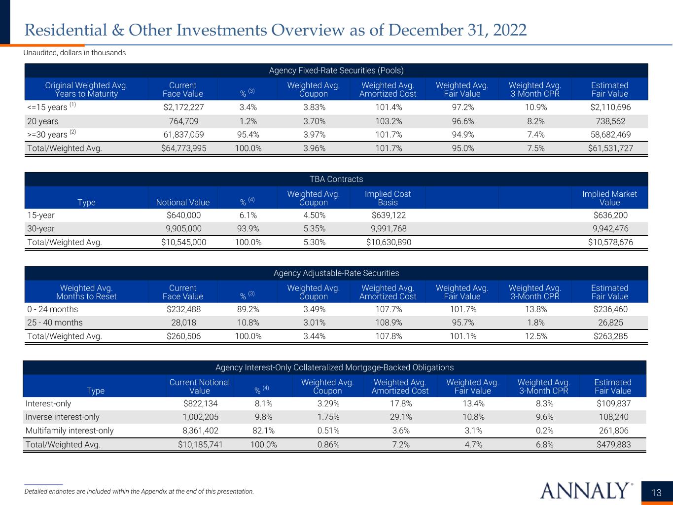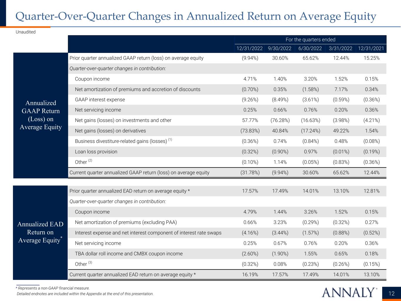 Annualized GAAP Return (Loss) on Average Equity Annualized EAD Return on Average Equity* ______________ * Represents a non-GAAP financial measure. Detailed endnotes are included within the Appendix at the end of this presentation. Unaudited 12 Quarter-Over-Quarter Changes in Annualized Return on Average Equity   For the quarters ended 12/31/2022 9/30/2022 6/30/2022 3/31/2022 12/31/2021 Prior quarter annualized GAAP return (loss) on average equity (9.94%) 30.60% 65.62% 12.44% 15.25% Quarter-over-quarter changes in contribution:   Coupon income 4.71% 1.40% 3.20% 1.52% 0.15%   Net amortization of premiums and accretion of discounts (0.70%) 0.35% (1.58%) 7.17% 0.34%   GAAP interest expense (9.26%) (8.49%) (3.61%) (0.59%) (0.36%) Net servicing income 0.25% 0.66% 0.76% 0.20% 0.36%   Net gains (losses) on investments and other 57.77% (76.28%) (16.63%) (3.98%) (4.21%) Net gains (losses) on derivatives (73.83%) 40.84% (17.24%) 49.22% 1.54% Business divestiture-related gains (losses) (1) (0.36%) 0.74% (0.84%) 0.48% (0.08%)   Loan loss provision (0.32%) (0.90%) 0.97% (0.01%) (0.19%)   Other (2) (0.10%) 1.14% (0.05%) (0.83%) (0.36%) Current quarter annualized GAAP return (loss) on average equity (31.78%) (9.94%) 30.60% 65.62% 12.44% Prior quarter annualized EAD return on average equity * 17.57% 17.49% 14.01% 13.10% 12.81% Quarter-over-quarter changes in contribution:   Coupon income 4.79% 1.44% 3.26% 1.52% 0.15%   Net amortization of premiums (excluding PAA) 0.66% 3.23% (0.29%) (0.32%) 0.27%   Interest expense and net interest component of interest rate swaps (4.16%) (3.44%) (1.57%) (0.88%) (0.52%) Net servicing income 0.25% 0.67% 0.76% 0.20% 0.36%   TBA dollar roll income and CMBX coupon income (2.60%) (1.90%) 1.55% 0.65% 0.18%   Other (3) (0.32%) 0.08% (0.23%) (0.26%) (0.15%) Current quarter annualized EAD return on average equity * 16.19% 17.57% 17.49% 14.01% 13.10%