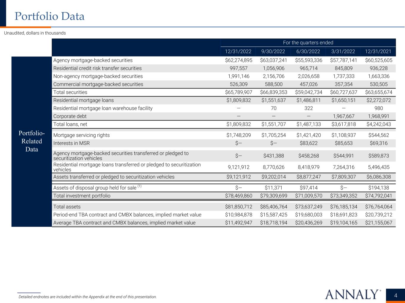 Portfolio Efficiency GAAP Key Statistics Income Statement Balance Sheet   For the quarters ended 12/31/2022 9/30/2022 GAAP net income (loss) per average common share (1) ($1.96) ($0.70) Earnings available for distribution per average common share *(1) $0.89 $1.06 Annualized GAAP return (loss) on average equity (31.78%) (9.94%) Annualized EAD return on average equity* 16.19% 17.57% Book value per common share $20.79 $19.94 GAAP leverage at period-end (2) 6.0x 5.8x Economic leverage at period-end *(2) 6.3x 7.1x GAAP capital ratio at period-end (3) 13.9% 12.8% Economic capital ratio at period-end *(3) 13.4% 11.8% Securities $65,789,907 $66,839,353 Loans, net 1,809,832 1,551,707 Mortgage servicing rights (4) 1,748,209 1,705,254 Assets transferred or pledged to securitization vehicles 9,121,912 9,202,014 Assets of disposal group held for sale (5) — 11,371 Total investment portfolio $78,469,860 $79,309,699 Net interest margin (6) 0.65% 1.42% Average yield on interest earning assets (7) 3.86% 3.47% Average GAAP cost of interest bearing liabilities (8) 3.71% 2.38% Net interest spread 0.15% 1.09% Net interest margin (excluding PAA) *(6) 1.90% 1.98% Average yield on interest earning assets (excluding PAA) *(7) 3.82% 3.24% Average economic cost of interest bearing liabilities *(8) 2.11% 1.54% Net interest spread (excluding PAA) * 1.71% 1.70% Operating expenses to earnings available for distribution * 9.60% 7.89% Annualized operating expenses as a % of average total assets 0.21% 0.19% Annualized operating expenses as a % of average total equity 1.54% 1.38% Unaudited, dollars in thousands except per share amounts 3 Financial Snapshot Non-GAAP Key Statistics ______________ * Represents a non-GAAP financial measure. Detailed endnotes are included within the Appendix at the end of this presentation.