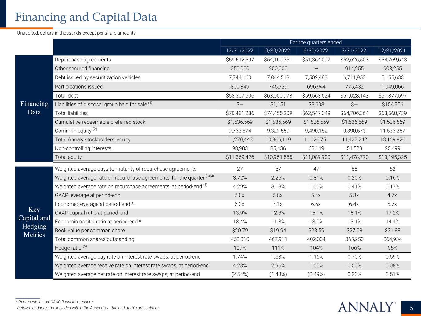 Portfolio- Related Data Unaudited, dollars in thousands 4 Portfolio Data   For the quarters ended 12/31/2022 9/30/2022 6/30/2022 3/31/2022 12/31/2021 Agency mortgage-backed securities $62,274,895 $63,037,241 $55,593,336 $57,787,141 $60,525,605 Residential credit risk transfer securities 997,557 1,056,906 965,714 845,809 936,228 Non-agency mortgage-backed securities 1,991,146 2,156,706 2,026,658 1,737,333 1,663,336 Commercial mortgage-backed securities 526,309 588,500 457,026 357,354 530,505 Total securities $65,789,907 $66,839,353 $59,042,734 $60,727,637 $63,655,674 Residential mortgage loans $1,809,832 $1,551,637 $1,486,811 $1,650,151 $2,272,072 Residential mortgage loan warehouse facility — 70 322 — 980 Corporate debt — — — 1,967,667 1,968,991 Total loans, net $1,809,832 $1,551,707 $1,487,133 $3,617,818 $4,242,043 Mortgage servicing rights $1,748,209 $1,705,254 $1,421,420 $1,108,937 $544,562 Interests in MSR $— $— $83,622 $85,653 $69,316 Agency mortgage-backed securities transferred or pledged to securitization vehicles $— $431,388 $458,268 $544,991 $589,873 Residential mortgage loans transferred or pledged to securitization vehicles 9,121,912 8,770,626 8,418,979 7,264,316 5,496,435 Assets transferred or pledged to securitization vehicles $9,121,912 $9,202,014 $8,877,247 $7,809,307 $6,086,308 Assets of disposal group held for sale (1) $— $11,371 $97,414 $— $194,138 Total investment portfolio $78,469,860 $79,309,699 $71,009,570 $73,349,352 $74,792,041 Total assets $81,850,712 $85,406,764 $73,637,249 $76,185,134 $76,764,064 Period-end TBA contract and CMBX balances, implied market value $10,984,878 $15,587,425 $19,680,003 $18,691,823 $20,739,212 Average TBA contract and CMBX balances, implied market value $11,492,947 $18,718,194 $20,436,269 $19,104,165 $21,155,067 ______________ Detailed endnotes are included within the Appendix at the end of this presentation.