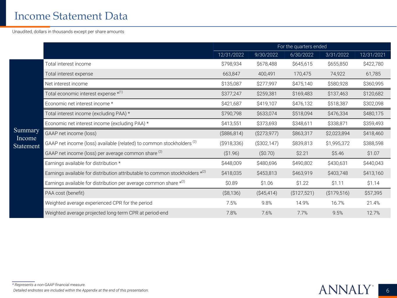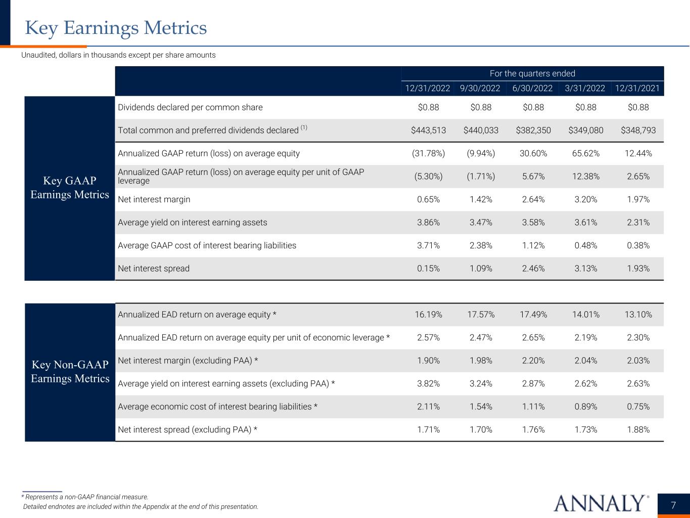 ______________ * Represents a non-GAAP financial measure. Detailed endnotes are included within the Appendix at the end of this presentation. Unaudited, dollars in thousands except per share amounts 6 Income Statement Data   For the quarters ended 12/31/2022 9/30/2022 6/30/2022 3/31/2022 12/31/2021 Total interest income $798,934 $678,488 $645,615 $655,850 $422,780 Total interest expense 663,847 400,491 170,475 74,922 61,785 Net interest income $135,087 $277,997 $475,140 $580,928 $360,995 Total economic interest expense *(1) $377,247 $259,381 $169,483 $137,463 $120,682 Economic net interest income * $421,687 $419,107 $476,132 $518,387 $302,098 Total interest income (excluding PAA) * $790,798 $633,074 $518,094 $476,334 $480,175 Economic net interest income (excluding PAA) * $413,551 $373,693 $348,611 $338,871 $359,493 GAAP net income (loss) ($886,814) ($273,977) $863,317 $2,023,894 $418,460 GAAP net income (loss) available (related) to common stockholders (2) ($918,336) ($302,147) $839,813 $1,995,372 $388,598 GAAP net income (loss) per average common share (2) ($1.96) ($0.70) $2.21 $5.46 $1.07 Earnings available for distribution * $448,009 $480,696 $490,802 $430,631 $440,043 Earnings available for distribution attributable to common stockholders *(2) $418,035 $453,813 $463,919 $403,748 $413,160 Earnings available for distribution per average common share *(2) $0.89 $1.06 $1.22 $1.11 $1.14 PAA cost (benefit) ($8,136) ($45,414) ($127,521) ($179,516) $57,395 Weighted average experienced CPR for the period 7.5% 9.8% 14.9% 16.7% 21.4% Weighted average projected long-term CPR at period-end 7.8% 7.6% 7.7% 9.5% 12.7% Summary Income Statement