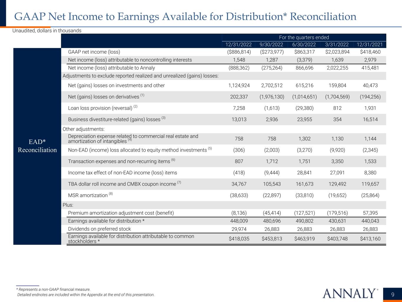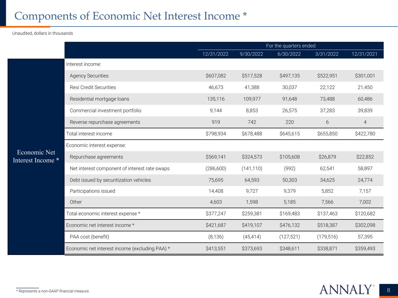 Economic Net Interest Income * ______________ * Represents a non-GAAP financial measure. Unaudited, dollars in thousands 8 Components of Economic Net Interest Income *   For the quarters ended 12/31/2022 9/30/2022 6/30/2022 3/31/2022 12/31/2021 Interest income:   Agency Securities $607,082 $517,528 $497,135 $522,951 $301,001 Resi Credit Securities 46,673 41,388 30,037 22,122 21,450   Residential mortgage loans 135,116 109,977 91,648 73,488 60,486   Commercial investment portfolio 9,144 8,853 26,575 37,283 39,839   Reverse repurchase agreements 919 742 220 6 4 Total interest income $798,934 $678,488 $645,615 $655,850 $422,780 Economic interest expense:   Repurchase agreements $569,141 $324,573 $105,608 $26,879 $22,852   Net interest component of interest rate swaps (286,600) (141,110) (992) 62,541 58,897   Debt issued by securitization vehicles 75,695 64,593 50,303 34,625 24,774   Participations issued 14,408 9,727 9,379 5,852 7,157   Other 4,603 1,598 5,185 7,566 7,002 Total economic interest expense * $377,247 $259,381 $169,483 $137,463 $120,682 Economic net interest income * $421,687 $419,107 $476,132 $518,387 $302,098   PAA cost (benefit) (8,136) (45,414) (127,521) (179,516) 57,395 Economic net interest income (excluding PAA) * $413,551 $373,693 $348,611 $338,871 $359,493