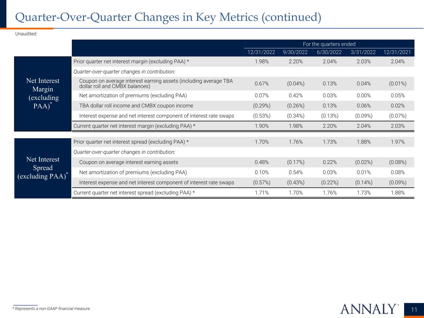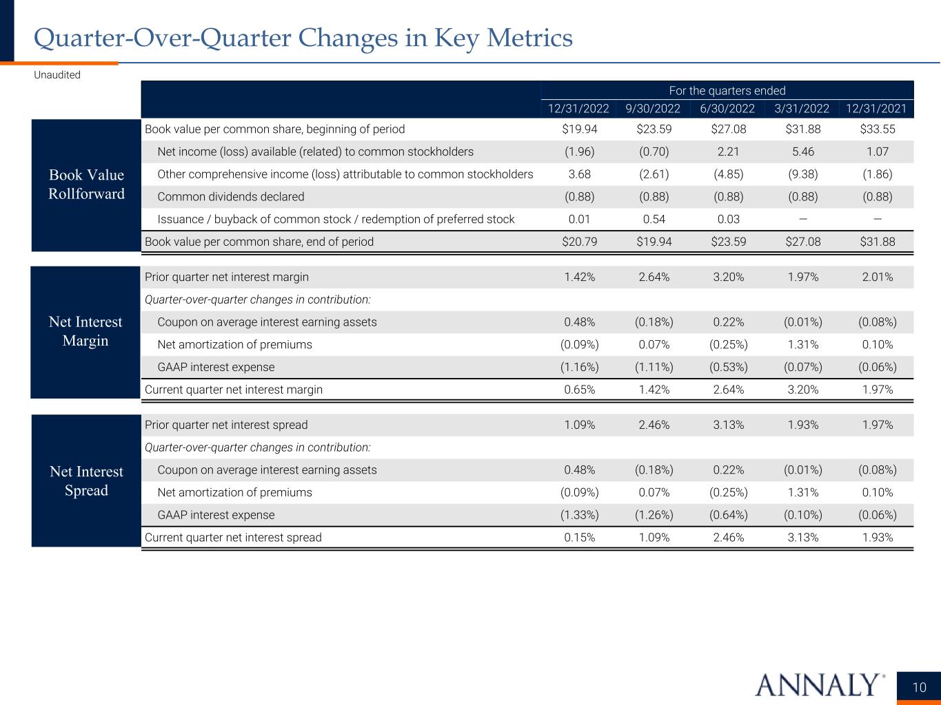 Book Value Rollforward Net Interest Margin Unaudited 10 Quarter-Over-Quarter Changes in Key Metrics   For the quarters ended 12/31/2022 9/30/2022 6/30/2022 3/31/2022 12/31/2021 Book value per common share, beginning of period $19.94 $23.59 $27.08 $31.88 $33.55   Net income (loss) available (related) to common stockholders (1.96) (0.70) 2.21 5.46 1.07   Other comprehensive income (loss) attributable to common stockholders 3.68 (2.61) (4.85) (9.38) (1.86)   Common dividends declared (0.88) (0.88) (0.88) (0.88) (0.88)   Issuance / buyback of common stock / redemption of preferred stock 0.01 0.54 0.03 — — Book value per common share, end of period $20.79 $19.94 $23.59 $27.08 $31.88 Prior quarter net interest margin 1.42% 2.64% 3.20% 1.97% 2.01% Quarter-over-quarter changes in contribution:   Coupon on average interest earning assets 0.48% (0.18%) 0.22% (0.01%) (0.08%)   Net amortization of premiums (0.09%) 0.07% (0.25%) 1.31% 0.10%   GAAP interest expense (1.16%) (1.11%) (0.53%) (0.07%) (0.06%) Current quarter net interest margin 0.65% 1.42% 2.64% 3.20% 1.97% Prior quarter net interest spread 1.09% 2.46% 3.13% 1.93% 1.97% Quarter-over-quarter changes in contribution:   Coupon on average interest earning assets 0.48% (0.18%) 0.22% (0.01%) (0.08%)   Net amortization of premiums (0.09%) 0.07% (0.25%) 1.31% 0.10%   GAAP interest expense (1.33%) (1.26%) (0.64%) (0.10%) (0.06%) Current quarter net interest spread 0.15% 1.09% 2.46% 3.13% 1.93% Net Interest Spread