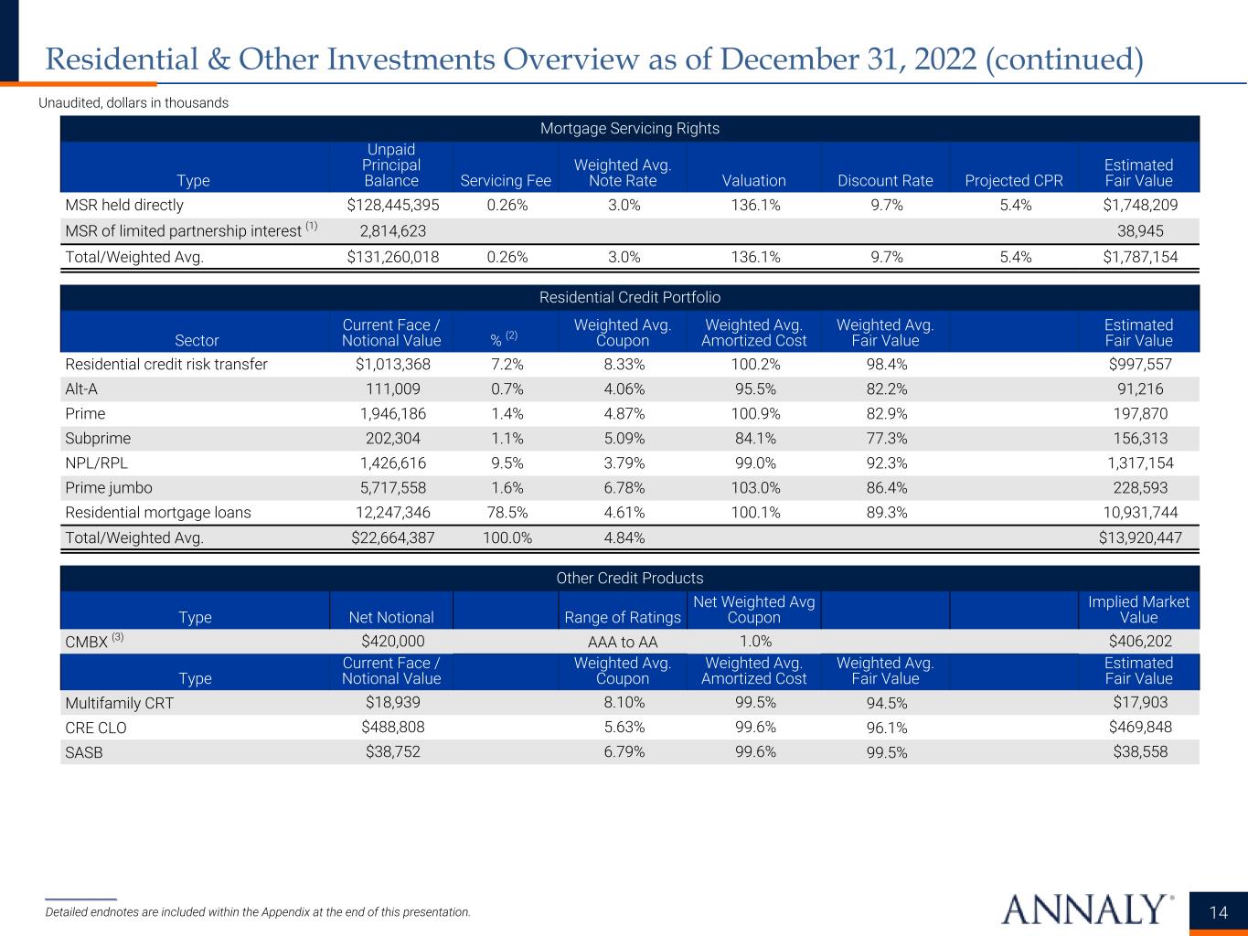 ______________ Detailed endnotes are included within the Appendix at the end of this presentation. Unaudited, dollars in thousands 13 Residential & Other Investments Overview as of December 31, 2022 Agency Fixed-Rate Securities (Pools) Original Weighted Avg. Years to Maturity Current Face Value % (3) Weighted Avg. Coupon Weighted Avg. Amortized Cost Weighted Avg. Fair Value Weighted Avg. 3-Month CPR Estimated Fair Value <=15 years (1) $2,172,227 3.4% 3.83% 101.4% 97.2% 10.9% $2,110,696 20 years 764,709 1.2% 3.70% 103.2% 96.6% 8.2% 738,562 >=30 years (2) 61,837,059 95.4% 3.97% 101.7% 94.9% 7.4% 58,682,469 Total/Weighted Avg. $64,773,995 100.0% 3.96% 101.7% 95.0% 7.5% $61,531,727                   TBA Contracts Type Notional Value % (4) Weighted Avg. Coupon Implied Cost Basis     Implied Market Value 15-year $640,000 6.1% 4.50% $639,122 $636,200 30-year 9,905,000 93.9% 5.35% 9,991,768 9,942,476 Total/Weighted Avg. $10,545,000 100.0% 5.30% $10,630,890 $10,578,676                                 Agency Adjustable-Rate Securities Weighted Avg. Months to Reset Current Face Value % (3) Weighted Avg. Coupon Weighted Avg. Amortized Cost Weighted Avg. Fair Value Weighted Avg. 3-Month CPR Estimated Fair Value 0 - 24 months $232,488 89.2% 3.49% 107.7% 101.7% 13.8% $236,460 25 - 40 months 28,018 10.8% 3.01% 108.9% 95.7% 1.8% 26,825 Total/Weighted Avg. $260,506 100.0% 3.44% 107.8% 101.1% 12.5% $263,285 Agency Interest-Only Collateralized Mortgage-Backed Obligations  Type Current Notional Value % (4)  Weighted Avg. Coupon Weighted Avg. Amortized Cost Weighted Avg. Fair Value Weighted Avg. 3-Month CPR Estimated Fair Value Interest-only $822,134 8.1% 3.29% 17.8% 13.4% 8.3% $109,837 Inverse interest-only 1,002,205 9.8% 1.75% 29.1% 10.8% 9.6% 108,240 Multifamily interest-only 8,361,402 82.1% 0.51% 3.6% 3.1% 0.2% 261,806 Total/Weighted Avg. $10,185,741 100.0% 0.86% 7.2% 4.7% 6.8% $479,883