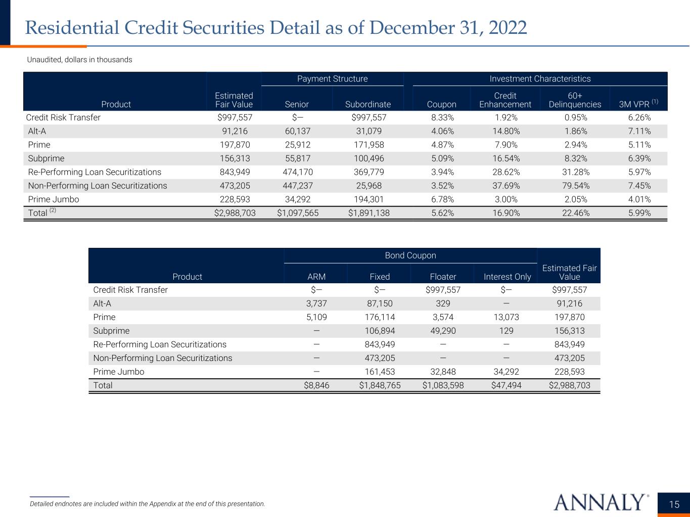 ______________ Detailed endnotes are included within the Appendix at the end of this presentation. Unaudited, dollars in thousands 14 Residential & Other Investments Overview as of December 31, 2022 (continued) Mortgage Servicing Rights Type  Unpaid Principal Balance Servicing Fee Weighted Avg. Note Rate Valuation Discount Rate Projected CPR Estimated Fair Value MSR held directly $128,445,395 0.26% 3.0% 136.1% 9.7% 5.4% $1,748,209 MSR of limited partnership interest (1) 2,814,623 38,945 Total/Weighted Avg. $131,260,018 0.26% 3.0% 136.1% 9.7% 5.4% $1,787,154               Residential Credit Portfolio  Sector Current Face / Notional Value % (2)  Weighted Avg. Coupon Weighted Avg. Amortized Cost Weighted Avg. Fair Value   Estimated Fair Value Residential credit risk transfer $1,013,368 7.2% 8.33% 100.2% 98.4% $997,557 Alt-A 111,009 0.7% 4.06% 95.5% 82.2% 91,216 Prime 1,946,186 1.4% 4.87% 100.9% 82.9% 197,870 Subprime 202,304 1.1% 5.09% 84.1% 77.3% 156,313 NPL/RPL 1,426,616 9.5% 3.79% 99.0% 92.3% 1,317,154 Prime jumbo 5,717,558 1.6% 6.78% 103.0% 86.4% 228,593 Residential mortgage loans 12,247,346 78.5% 4.61% 100.1% 89.3% 10,931,744 Total/Weighted Avg. $22,664,387 100.0% 4.84% $13,920,447 Other Credit Products Type Net Notional Range of Ratings Net Weighted Avg Coupon Implied Market Value CMBX (3) $420,000 AAA to AA 1.0% $406,202 Type Current Face / Notional Value Weighted Avg. Coupon Weighted Avg. Amortized Cost Weighted Avg. Fair Value Estimated Fair Value Multifamily CRT $18,939 8.10% 99.5% 94.5% $17,903 CRE CLO $488,808 5.63% 99.6% 96.1% $469,848 SASB $38,752 6.79% 99.6% 99.5% $38,558