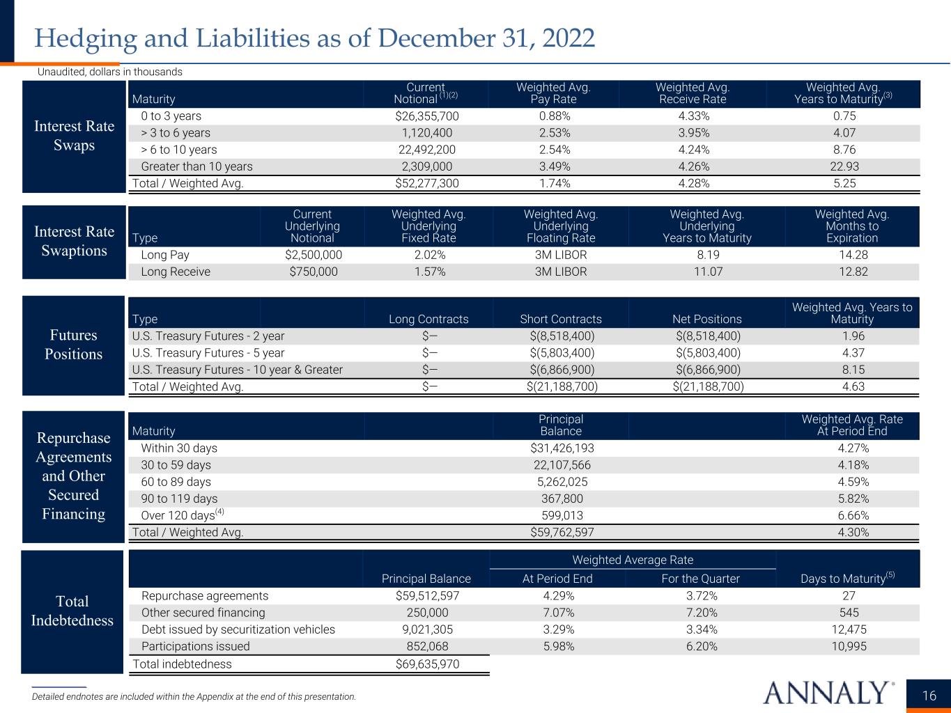 ______________ Detailed endnotes are included within the Appendix at the end of this presentation. 16 Unaudited, dollars in thousands Hedging and Liabilities as of December 31, 2022   Principal Balance Weighted Average Rate Days to Maturity(5)At Period End For the Quarter Repurchase agreements $59,512,597 4.29% 3.72% 27 Other secured financing 250,000 7.07% 7.20% 545 Debt issued by securitization vehicles 9,021,305 3.29% 3.34% 12,475 Participations issued 852,068 5.98% 6.20% 10,995 Total indebtedness $69,635,970 Maturity Current Notional (1)(2) Weighted Avg. Pay Rate Weighted Avg. Receive Rate Weighted Avg. Years to Maturity(3) 0 to 3 years $26,355,700 0.88% 4.33% 0.75 > 3 to 6 years 1,120,400 2.53% 3.95% 4.07 > 6 to 10 years 22,492,200 2.54% 4.24% 8.76 Greater than 10 years 2,309,000 3.49% 4.26% 22.93 Total / Weighted Avg. $52,277,300 1.74% 4.28% 5.25 Type Current Underlying Notional Weighted Avg. Underlying Fixed Rate Weighted Avg. Underlying Floating Rate Weighted Avg. Underlying Years to Maturity Weighted Avg. Months to Expiration Long Pay $2,500,000 2.02% 3M LIBOR 8.19 14.28 Long Receive $750,000 1.57% 3M LIBOR 11.07 12.82 Type Long Contracts Short Contracts Net Positions Weighted Avg. Years to Maturity U.S. Treasury Futures - 2 year $— $(8,518,400) $(8,518,400) 1.96 U.S. Treasury Futures - 5 year $— $(5,803,400) $(5,803,400) 4.37 U.S. Treasury Futures - 10 year & Greater $— $(6,866,900) $(6,866,900) 8.15 Total / Weighted Avg. $— $(21,188,700) $(21,188,700) 4.63 Maturity   Principal Balance   Weighted Avg. Rate At Period End Within 30 days   $31,426,193   4.27% 30 to 59 days 22,107,566 4.18% 60 to 89 days   5,262,025   4.59% 90 to 119 days 367,800 5.82% Over 120 days(4)   599,013   6.66% Total / Weighted Avg.   $59,762,597   4.30% Interest Rate Swaps Interest Rate Swaptions Futures Positions Repurchase Agreements and Other Secured Financing Total Indebtedness