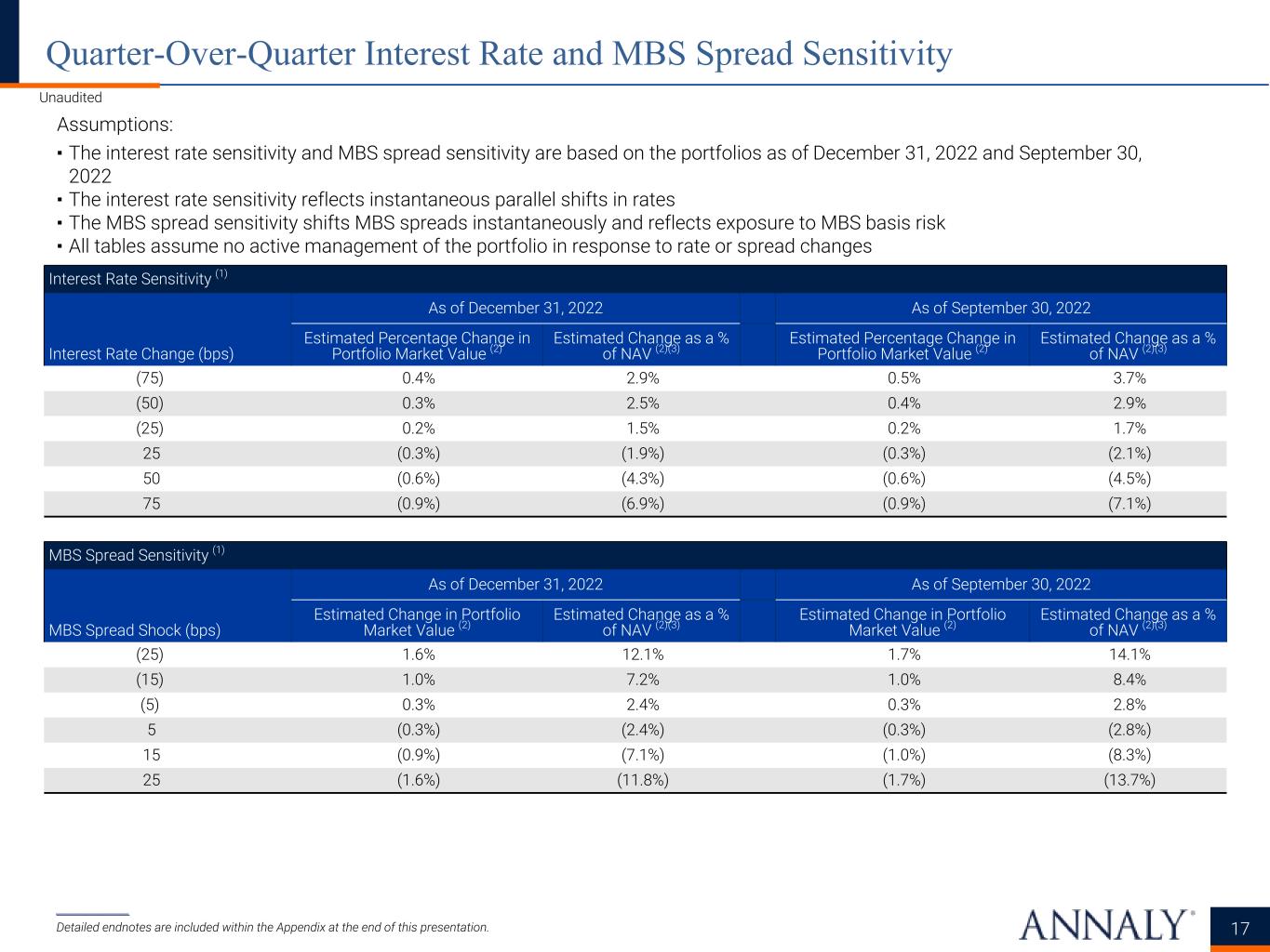 ______________ Detailed endnotes are included within the Appendix at the end of this presentation. Unaudited 17 Quarter-Over-Quarter Interest Rate and MBS Spread Sensitivity Assumptions: ▪ The interest rate sensitivity and MBS spread sensitivity are based on the portfolios as of December 31, 2022 and September 30, 2022 ▪ The interest rate sensitivity reflects instantaneous parallel shifts in rates ▪ The MBS spread sensitivity shifts MBS spreads instantaneously and reflects exposure to MBS basis risk ▪ All tables assume no active management of the portfolio in response to rate or spread changes Interest Rate Sensitivity (1) Interest Rate Change (bps) As of December 31, 2022   As of September 30, 2022 Estimated Percentage Change in Portfolio Market Value (2) Estimated Change as a % of NAV (2)(3)   Estimated Percentage Change in Portfolio Market Value (2) Estimated Change as a % of NAV (2)(3) (75) 0.4% 2.9% 0.5% 3.7% (50)   0.3% 2.5%   0.4% 2.9% (25) 0.2% 1.5% 0.2% 1.7% 25   (0.3%) (1.9%)   (0.3%) (2.1%) 50 (0.6%) (4.3%) (0.6%) (4.5%) 75   (0.9%) (6.9%)   (0.9%) (7.1%) MBS Spread Sensitivity (1) MBS Spread Shock (bps) As of December 31, 2022   As of September 30, 2022 Estimated Change in Portfolio Market Value (2) Estimated Change as a % of NAV (2)(3)   Estimated Change in Portfolio Market Value (2) Estimated Change as a % of NAV (2)(3) (25) 1.6% 12.1% 1.7% 14.1% (15)   1.0% 7.2%   1.0% 8.4% (5) 0.3% 2.4% 0.3% 2.8% 5   (0.3%) (2.4%)   (0.3%) (2.8%) 15 (0.9%) (7.1%) (1.0%) (8.3%) 25   (1.6%) (11.8%)   (1.7%) (13.7%)