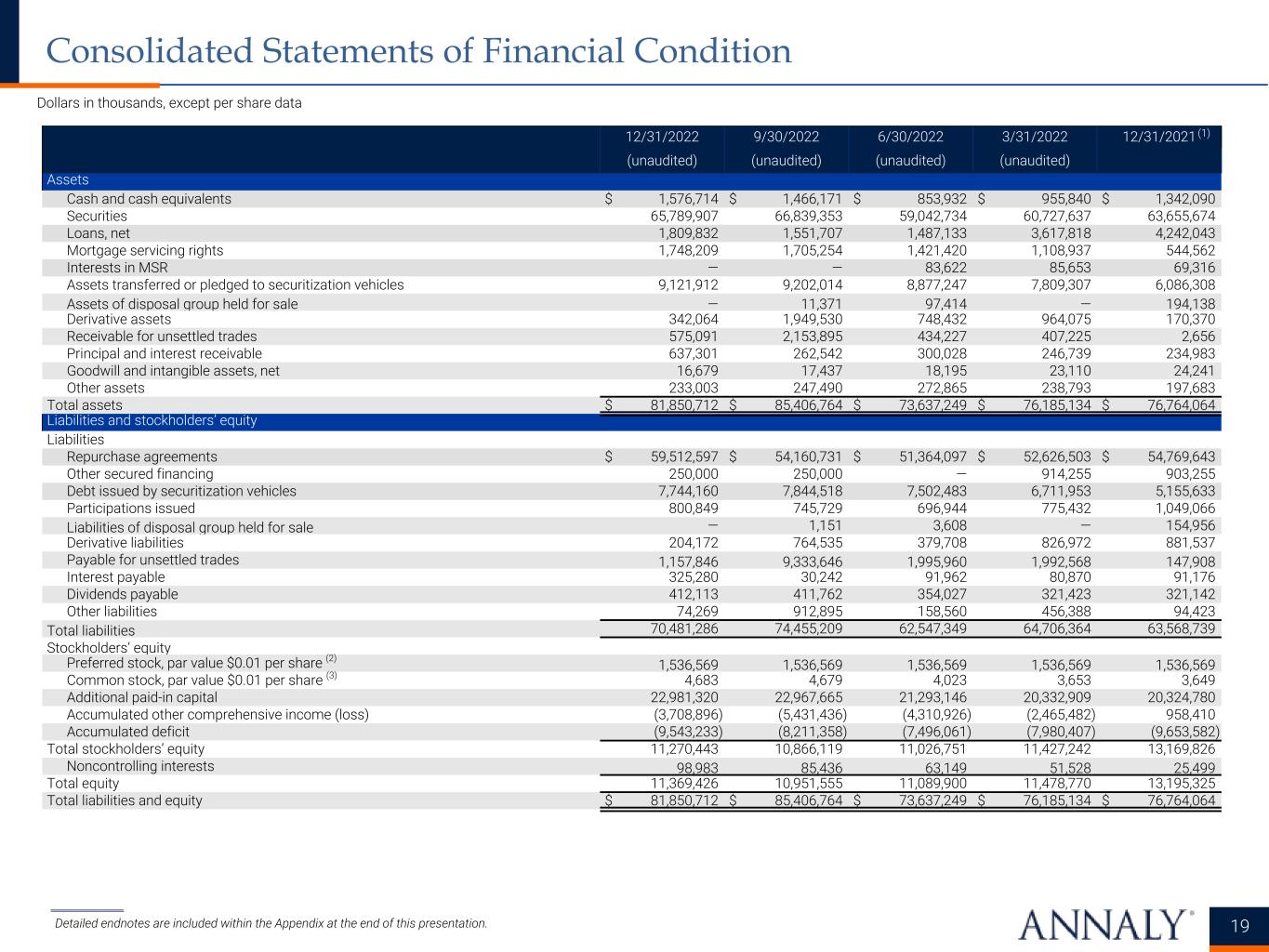 Dollars in thousands, except per share data 19 Consolidated Statements of Financial Condition 12/31/2022 9/30/2022 6/30/2022 3/31/2022 12/31/2021 (unaudited) (unaudited) (unaudited) (unaudited) Assets Cash and cash equivalents $ 1,576,714 $ 1,466,171 $ 853,932 $ 955,840 $ 1,342,090 Securities 65,789,907 66,839,353 59,042,734 60,727,637 63,655,674 Loans, net 1,809,832 1,551,707 1,487,133 3,617,818 4,242,043 Mortgage servicing rights 1,748,209 1,705,254 1,421,420 1,108,937 544,562 Interests in MSR — — 83,622 85,653 69,316 Assets transferred or pledged to securitization vehicles 9,121,912 9,202,014 8,877,247 7,809,307 6,086,308 Assets of disposal group held for sale — 11,371 97,414 — 194,138 Derivative assets 342,064 1,949,530 748,432 964,075 170,370 Receivable for unsettled trades 575,091 2,153,895 434,227 407,225 2,656 Principal and interest receivable 637,301 262,542 300,028 246,739 234,983 Goodwill and intangible assets, net 16,679 17,437 18,195 23,110 24,241 Other assets 233,003 247,490 272,865 238,793 197,683 Total assets $ 81,850,712 $ 85,406,764 $ 73,637,249 $ 76,185,134 $ 76,764,064 Liabilities and stockholders’ equity Liabilities Repurchase agreements $ 59,512,597 $ 54,160,731 $ 51,364,097 $ 52,626,503 $ 54,769,643 Other secured financing 250,000 250,000 — 914,255 903,255 Debt issued by securitization vehicles 7,744,160 7,844,518 7,502,483 6,711,953 5,155,633 Participations issued 800,849 745,729 696,944 775,432 1,049,066 Liabilities of disposal group held for sale — 1,151 3,608 — 154,956 Derivative liabilities 204,172 764,535 379,708 826,972 881,537 Payable for unsettled trades 1,157,846 9,333,646 1,995,960 1,992,568 147,908 Interest payable 325,280 30,242 91,962 80,870 91,176 Dividends payable 412,113 411,762 354,027 321,423 321,142 Other liabilities 74,269 912,895 158,560 456,388 94,423 Total liabilities 70,481,286 74,455,209 62,547,349 64,706,364 63,568,739 Stockholders’ equity Preferred stock, par value $0.01 per share (2) 1,536,569 1,536,569 1,536,569 1,536,569 1,536,569 Common stock, par value $0.01 per share (3) 4,683 4,679 4,023 3,653 3,649 Additional paid-in capital 22,981,320 22,967,665 21,293,146 20,332,909 20,324,780 Accumulated other comprehensive income (loss) (3,708,896) (5,431,436) (4,310,926) (2,465,482) 958,410 Accumulated deficit (9,543,233) (8,211,358) (7,496,061) (7,980,407) (9,653,582) Total stockholders’ equity 11,270,443 10,866,119 11,026,751 11,427,242 13,169,826 Noncontrolling interests 98,983 85,436 63,149 51,528 25,499 Total equity 11,369,426 10,951,555 11,089,900 11,478,770 13,195,325 Total liabilities and equity $ 81,850,712 $ 85,406,764 $ 73,637,249 $ 76,185,134 $ 76,764,064 ______________ Detailed endnotes are included within the Appendix at the end of this presentation. (1)
