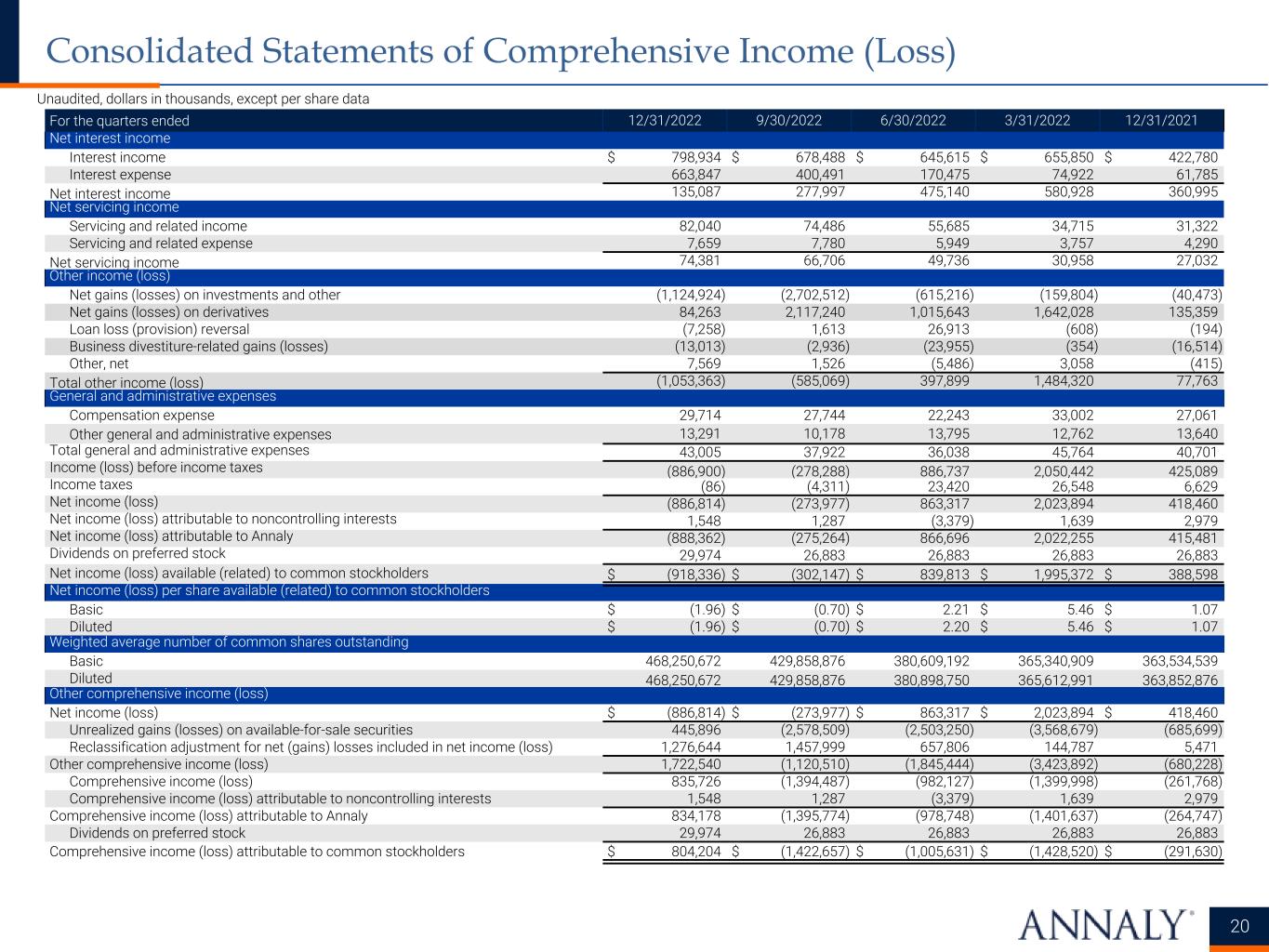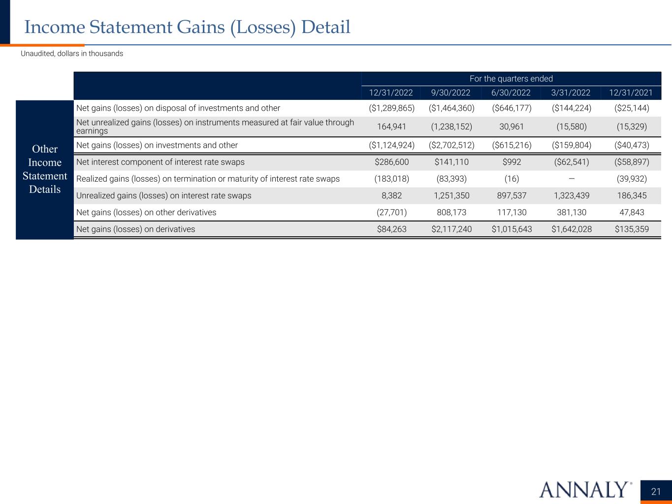 Unaudited, dollars in thousands, except per share data 20 Consolidated Statements of Comprehensive Income (Loss) For the quarters ended 12/31/2022 9/30/2022 6/30/2022 3/31/2022 12/31/2021 Net interest income Interest income $ 798,934 $ 678,488 $ 645,615 $ 655,850 $ 422,780 Interest expense 663,847 400,491 170,475 74,922 61,785 Net interest income 135,087 277,997 475,140 580,928 360,995 Net servicing income Servicing and related income 82,040 74,486 55,685 34,715 31,322 Servicing and related expense 7,659 7,780 5,949 3,757 4,290 Net servicing income 74,381 66,706 49,736 30,958 27,032 Other income (loss) Net gains (losses) on investments and other (1,124,924) (2,702,512) (615,216) (159,804) (40,473) Net gains (losses) on derivatives 84,263 2,117,240 1,015,643 1,642,028 135,359 Loan loss (provision) reversal (7,258) 1,613 26,913 (608) (194) Business divestiture-related gains (losses) (13,013) (2,936) (23,955) (354) (16,514) Other, net 7,569 1,526 (5,486) 3,058 (415) Total other income (loss) (1,053,363) (585,069) 397,899 1,484,320 77,763 General and administrative expenses Compensation expense 29,714 27,744 22,243 33,002 27,061 Other general and administrative expenses 13,291 10,178 13,795 12,762 13,640 Total general and administrative expenses 43,005 37,922 36,038 45,764 40,701 Income (loss) before income taxes (886,900) (278,288) 886,737 2,050,442 425,089 Income taxes (86) (4,311) 23,420 26,548 6,629 Net income (loss) (886,814) (273,977) 863,317 2,023,894 418,460 Net income (loss) attributable to noncontrolling interests 1,548 1,287 (3,379) 1,639 2,979 Net income (loss) attributable to Annaly (888,362) (275,264) 866,696 2,022,255 415,481 Dividends on preferred stock 29,974 26,883 26,883 26,883 26,883 Net income (loss) available (related) to common stockholders $ (918,336) $ (302,147) $ 839,813 $ 1,995,372 $ 388,598 Net income (loss) per share available (related) to common stockholders Basic $ (1.96) $ (0.70) $ 2.21 $ 5.46 $ 1.07 Diluted $ (1.96) $ (0.70) $ 2.20 $ 5.46 $ 1.07 Weighted average number of common shares outstanding Basic 468,250,672 429,858,876 380,609,192 365,340,909 363,534,539 Diluted 468,250,672 429,858,876 380,898,750 365,612,991 363,852,876 Other comprehensive income (loss) Net income (loss) $ (886,814) $ (273,977) $ 863,317 $ 2,023,894 $ 418,460 Unrealized gains (losses) on available-for-sale securities 445,896 (2,578,509) (2,503,250) (3,568,679) (685,699) Reclassification adjustment for net (gains) losses included in net income (loss) 1,276,644 1,457,999 657,806 144,787 5,471 Other comprehensive income (loss) 1,722,540 (1,120,510) (1,845,444) (3,423,892) (680,228) Comprehensive income (loss) 835,726 (1,394,487) (982,127) (1,399,998) (261,768) Comprehensive income (loss) attributable to noncontrolling interests 1,548 1,287 (3,379) 1,639 2,979 Comprehensive income (loss) attributable to Annaly 834,178 (1,395,774) (978,748) (1,401,637) (264,747) Dividends on preferred stock 29,974 26,883 26,883 26,883 26,883 Comprehensive income (loss) attributable to common stockholders $ 804,204 $ (1,422,657) $ (1,005,631) $ (1,428,520) $ (291,630)