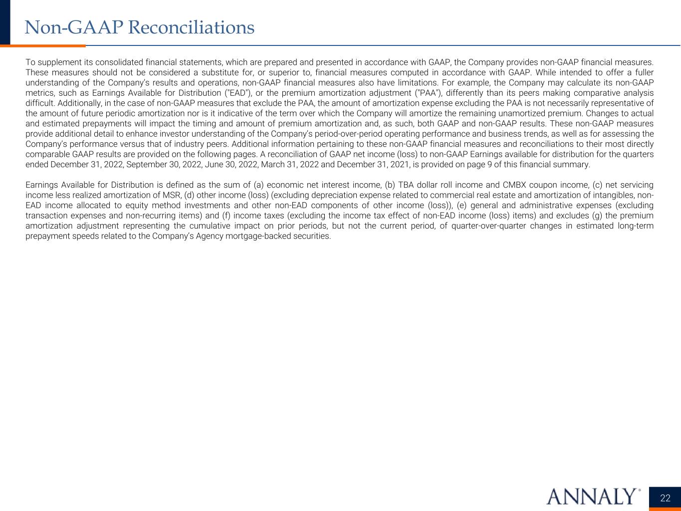 22 Non-GAAP Reconciliations To supplement its consolidated financial statements, which are prepared and presented in accordance with GAAP, the Company provides non-GAAP financial measures. These measures should not be considered a substitute for, or superior to, financial measures computed in accordance with GAAP. While intended to offer a fuller understanding of the Company’s results and operations, non-GAAP financial measures also have limitations. For example, the Company may calculate its non-GAAP metrics, such as Earnings Available for Distribution ("EAD"), or the premium amortization adjustment ("PAA"), differently than its peers making comparative analysis difficult. Additionally, in the case of non-GAAP measures that exclude the PAA, the amount of amortization expense excluding the PAA is not necessarily representative of the amount of future periodic amortization nor is it indicative of the term over which the Company will amortize the remaining unamortized premium. Changes to actual and estimated prepayments will impact the timing and amount of premium amortization and, as such, both GAAP and non-GAAP results. These non-GAAP measures provide additional detail to enhance investor understanding of the Company’s period-over-period operating performance and business trends, as well as for assessing the Company’s performance versus that of industry peers. Additional information pertaining to these non-GAAP financial measures and reconciliations to their most directly comparable GAAP results are provided on the following pages. A reconciliation of GAAP net income (loss) to non-GAAP Earnings available for distribution for the quarters ended December 31, 2022, September 30, 2022, June 30, 2022, March 31, 2022 and December 31, 2021, is provided on page 9 of this financial summary. Earnings Available for Distribution is defined as the sum of (a) economic net interest income, (b) TBA dollar roll income and CMBX coupon income, (c) net servicing income less realized amortization of MSR, (d) other income (loss) (excluding depreciation expense related to commercial real estate and amortization of intangibles, non- EAD income allocated to equity method investments and other non-EAD components of other income (loss)), (e) general and administrative expenses (excluding transaction expenses and non-recurring items) and (f) income taxes (excluding the income tax effect of non-EAD income (loss) items) and excludes (g) the premium amortization adjustment representing the cumulative impact on prior periods, but not the current period, of quarter-over-quarter changes in estimated long-term prepayment speeds related to the Company’s Agency mortgage-backed securities.