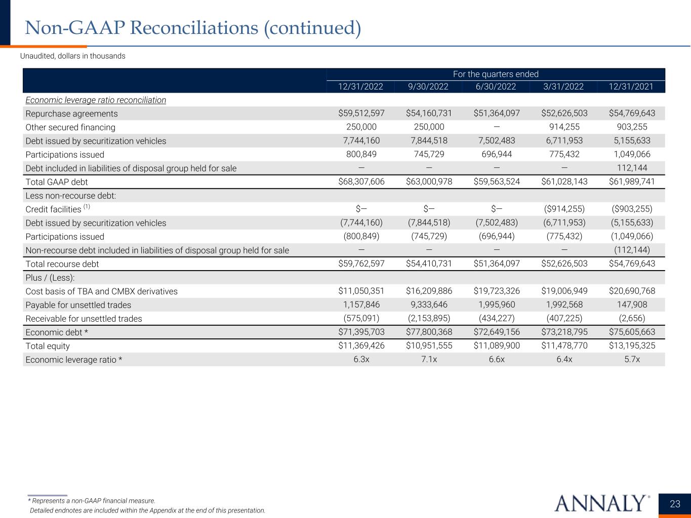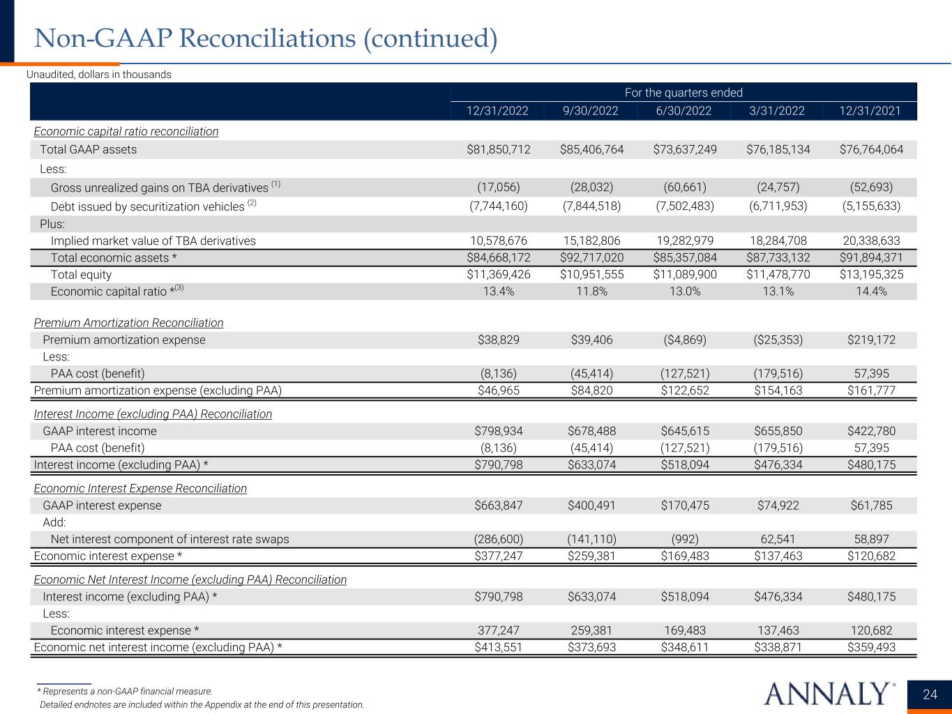 Unaudited, dollars in thousands 23 Non-GAAP Reconciliations (continued)   For the quarters ended 12/31/2022 9/30/2022 6/30/2022 3/31/2022 12/31/2021 Economic leverage ratio reconciliation Repurchase agreements $59,512,597 $54,160,731 $51,364,097 $52,626,503 $54,769,643 Other secured financing 250,000 250,000 — 914,255 903,255 Debt issued by securitization vehicles 7,744,160 7,844,518 7,502,483 6,711,953 5,155,633 Participations issued 800,849 745,729 696,944 775,432 1,049,066 Debt included in liabilities of disposal group held for sale — — — — 112,144 Total GAAP debt $68,307,606 $63,000,978 $59,563,524 $61,028,143 $61,989,741 Less non-recourse debt: Credit facilities (1) $— $— $— ($914,255) ($903,255) Debt issued by securitization vehicles (7,744,160) (7,844,518) (7,502,483) (6,711,953) (5,155,633) Participations issued (800,849) (745,729) (696,944) (775,432) (1,049,066) Non-recourse debt included in liabilities of disposal group held for sale — — — — (112,144) Total recourse debt $59,762,597 $54,410,731 $51,364,097 $52,626,503 $54,769,643 Plus / (Less): Cost basis of TBA and CMBX derivatives $11,050,351 $16,209,886 $19,723,326 $19,006,949 $20,690,768 Payable for unsettled trades 1,157,846 9,333,646 1,995,960 1,992,568 147,908 Receivable for unsettled trades (575,091) (2,153,895) (434,227) (407,225) (2,656) Economic debt * $71,395,703 $77,800,368 $72,649,156 $73,218,795 $75,605,663 Total equity $11,369,426 $10,951,555 $11,089,900 $11,478,770 $13,195,325 Economic leverage ratio * 6.3x 7.1x 6.6x 6.4x 5.7x ______________ * Represents a non-GAAP financial measure. Detailed endnotes are included within the Appendix at the end of this presentation.