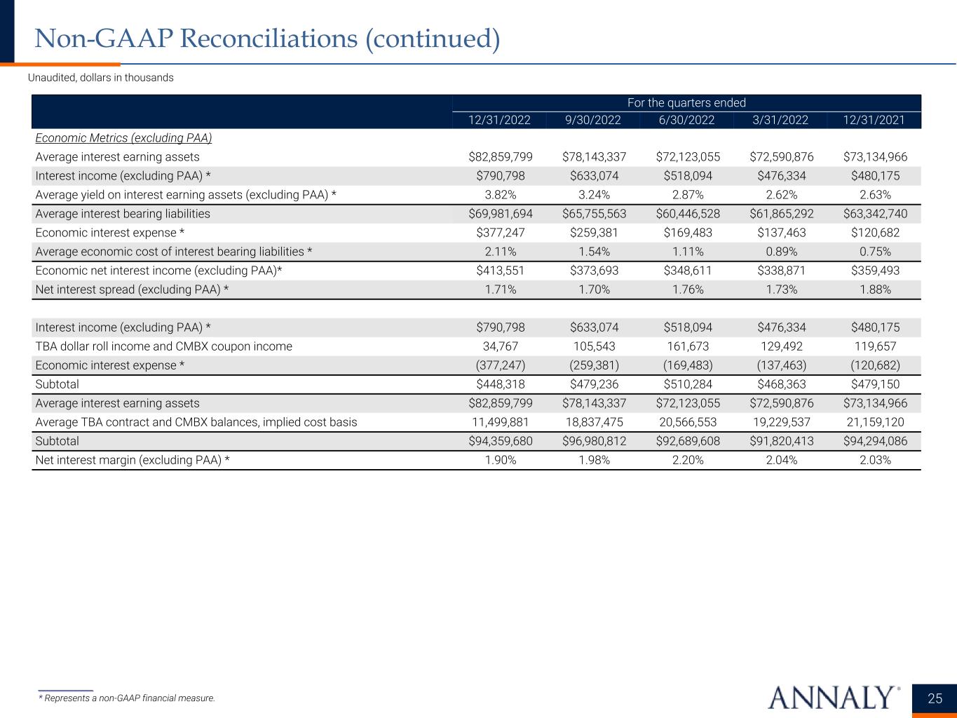 Unaudited, dollars in thousands 24 Non-GAAP Reconciliations (continued)   For the quarters ended 12/31/2022 9/30/2022 6/30/2022 3/31/2022 12/31/2021 Economic capital ratio reconciliation Total GAAP assets $81,850,712 $85,406,764 $73,637,249 $76,185,134 $76,764,064 Less: Gross unrealized gains on TBA derivatives (1) (17,056) (28,032) (60,661) (24,757) (52,693) Debt issued by securitization vehicles (2) (7,744,160) (7,844,518) (7,502,483) (6,711,953) (5,155,633) Plus: Implied market value of TBA derivatives 10,578,676 15,182,806 19,282,979 18,284,708 20,338,633 Total economic assets * $84,668,172 $92,717,020 $85,357,084 $87,733,132 $91,894,371 Total equity $11,369,426 $10,951,555 $11,089,900 $11,478,770 $13,195,325 Economic capital ratio *(3) 13.4% 11.8% 13.0% 13.1% 14.4% Premium Amortization Reconciliation Premium amortization expense $38,829 $39,406 ($4,869) ($25,353) $219,172 Less:   PAA cost (benefit) (8,136) (45,414) (127,521) (179,516) 57,395 Premium amortization expense (excluding PAA) $46,965 $84,820 $122,652 $154,163 $161,777 Interest Income (excluding PAA) Reconciliation GAAP interest income $798,934 $678,488 $645,615 $655,850 $422,780   PAA cost (benefit) (8,136) (45,414) (127,521) (179,516) 57,395 Interest income (excluding PAA) * $790,798 $633,074 $518,094 $476,334 $480,175 Economic Interest Expense Reconciliation GAAP interest expense $663,847 $400,491 $170,475 $74,922 $61,785 Add:   Net interest component of interest rate swaps (286,600) (141,110) (992) 62,541 58,897 Economic interest expense * $377,247 $259,381 $169,483 $137,463 $120,682 Economic Net Interest Income (excluding PAA) Reconciliation Interest income (excluding PAA) * $790,798 $633,074 $518,094 $476,334 $480,175 Less: Economic interest expense * 377,247 259,381 169,483 137,463 120,682 Economic net interest income (excluding PAA) * $413,551 $373,693 $348,611 $338,871 $359,493 ______________ * Represents a non-GAAP financial measure. Detailed endnotes are included within the Appendix at the end of this presentation.