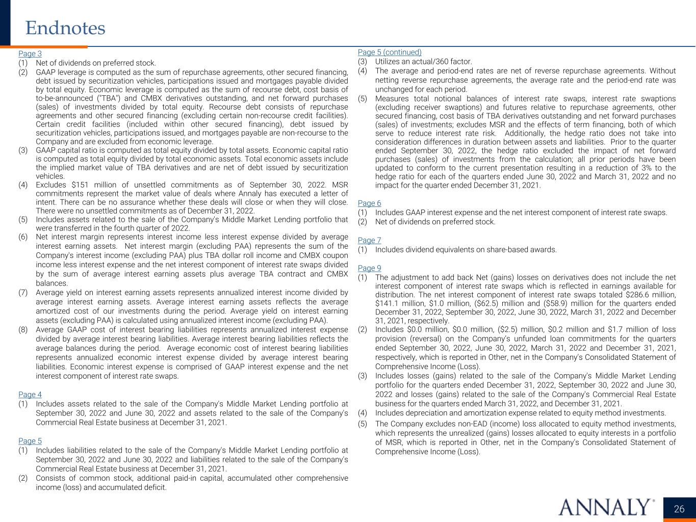 26 Endnotes Page 3 (1) Net of dividends on preferred stock. (2) GAAP leverage is computed as the sum of repurchase agreements, other secured financing, debt issued by securitization vehicles, participations issued and mortgages payable divided by total equity. Economic leverage is computed as the sum of recourse debt, cost basis of to-be-announced ("TBA") and CMBX derivatives outstanding, and net forward purchases (sales) of investments divided by total equity. Recourse debt consists of repurchase agreements and other secured financing (excluding certain non-recourse credit facilities). Certain credit facilities (included within other secured financing), debt issued by securitization vehicles, participations issued, and mortgages payable are non-recourse to the Company and are excluded from economic leverage. (3) GAAP capital ratio is computed as total equity divided by total assets. Economic capital ratio is computed as total equity divided by total economic assets. Total economic assets include the implied market value of TBA derivatives and are net of debt issued by securitization vehicles. (4) Excludes $151 million of unsettled commitments as of September 30, 2022. MSR commitments represent the market value of deals where Annaly has executed a letter of intent. There can be no assurance whether these deals will close or when they will close. There were no unsettled commitments as of December 31, 2022. (5) Includes assets related to the sale of the Company's Middle Market Lending portfolio that were transferred in the fourth quarter of 2022. (6) Net interest margin represents interest income less interest expense divided by average interest earning assets. Net interest margin (excluding PAA) represents the sum of the Company's interest income (excluding PAA) plus TBA dollar roll income and CMBX coupon income less interest expense and the net interest component of interest rate swaps divided by the sum of average interest earning assets plus average TBA contract and CMBX balances. (7) Average yield on interest earning assets represents annualized interest income divided by average interest earning assets. Average interest earning assets reflects the average amortized cost of our investments during the period. Average yield on interest earning assets (excluding PAA) is calculated using annualized interest income (excluding PAA). (8) Average GAAP cost of interest bearing liabilities represents annualized interest expense divided by average interest bearing liabilities. Average interest bearing liabilities reflects the average balances during the period. Average economic cost of interest bearing liabilities represents annualized economic interest expense divided by average interest bearing liabilities. Economic interest expense is comprised of  GAAP interest expense and the net interest component of interest rate swaps. Page 4 (1) Includes assets related to the sale of the Company's Middle Market Lending portfolio at September 30, 2022 and June 30, 2022 and assets related to the sale of the Company's Commercial Real Estate business at December 31, 2021. Page 5 (1) Includes liabilities related to the sale of the Company's Middle Market Lending portfolio at September 30, 2022 and June 30, 2022 and liabilities related to the sale of the Company's Commercial Real Estate business at December 31, 2021. (2) Consists of common stock, additional paid-in capital, accumulated other comprehensive income (loss) and accumulated deficit. Page 5 (continued) (3) Utilizes an actual/360 factor. (4) The average and period-end rates are net of reverse repurchase agreements. Without netting reverse repurchase agreements, the average rate and the period-end rate was unchanged for each period. (5) Measures total notional balances of interest rate swaps, interest rate swaptions (excluding receiver swaptions) and futures relative to repurchase agreements, other secured financing, cost basis of TBA derivatives outstanding and net forward purchases (sales) of investments; excludes MSR and the effects of term financing, both of which serve to reduce interest rate risk. Additionally, the hedge ratio does not take into consideration differences in duration between assets and liabilities. Prior to the quarter ended September 30, 2022, the hedge ratio excluded the impact of net forward purchases (sales) of investments from the calculation; all prior periods have been updated to conform to the current presentation resulting in a reduction of 3% to the hedge ratio for each of the quarters ended June 30, 2022 and March 31, 2022 and no impact for the quarter ended December 31, 2021. Page 6 (1) Includes GAAP interest expense and the net interest component of interest rate swaps. (2) Net of dividends on preferred stock. Page 7 (1) Includes dividend equivalents on share-based awards. Page 9 (1) The adjustment to add back Net (gains) losses on derivatives does not include the net interest component of interest rate swaps which is reflected in earnings available for distribution. The net interest component of interest rate swaps totaled $286.6 million, $141.1 million, $1.0 million, ($62.5) million and ($58.9) million for the quarters ended December 31, 2022, September 30, 2022, June 30, 2022, March 31, 2022 and December 31, 2021, respectively. (2) Includes $0.0 million, $0.0 million, ($2.5) million, $0.2 million and $1.7 million of loss provision (reversal) on the Company’s unfunded loan commitments for the quarters ended September 30, 2022, June 30, 2022, March 31, 2022 and December 31, 2021, respectively, which is reported in Other, net in the Company’s Consolidated Statement of Comprehensive Income (Loss). (3) Includes losses (gains) related to the sale of the Company's Middle Market Lending portfolio for the quarters ended December 31, 2022, September 30, 2022 and June 30, 2022 and losses (gains) related to the sale of the Company's Commercial Real Estate business for the quarters ended March 31, 2022, and December 31, 2