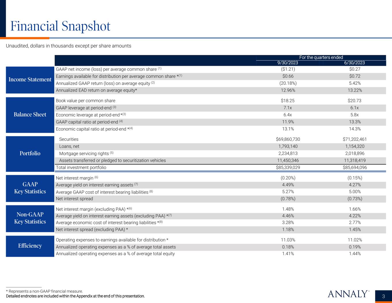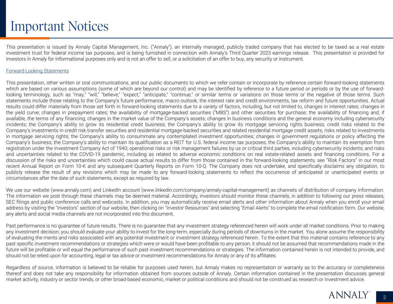 Important Notices 2 This presentation is issued by Annaly Capital Management, Inc. ("Annaly"), an internally managed, publicly traded company that has elected to be taxed as a real estate investment trust for federal income tax purposes, and is being furnished in connection with Annaly’s Third Quarter 2023 earnings release. This presentation is provided for investors in Annaly for informational purposes only and is not an offer to sell, or a solicitation of an offer to buy, any security or instrument. Forward-Looking Statements This presentation, other written or oral communications, and our public documents to which we refer contain or incorporate by reference certain forward-looking statements which are based on various assumptions (some of which are beyond our control) and may be identified by reference to a future period or periods or by the use of forward- looking terminology, such as “may,” “will,” “believe,” “expect,” “anticipate,” “continue,” or similar terms or variations on those terms or the negative of those terms. Such statements include those relating to the Company’s future performance, macro outlook, the interest rate and credit environments, tax reform and future opportunities. Actual results could differ materially from those set forth in forward-looking statements due to a variety of factors, including, but not limited to, changes in interest rates; changes in the yield curve; changes in prepayment rates; the availability of mortgage-backed securities (“MBS”) and other securities for purchase; the availability of financing and, if available, the terms of any financing; changes in the market value of the Company’s assets; changes in business conditions and the general economy including cybersecurity incidents; the Company’s ability to grow its residential credit business; the Company's ability to grow its mortgage servicing rights business; credit risks related to the Company’s investments in credit risk transfer securities and residential mortgage-backed securities and related residential mortgage credit assets; risks related to investments in mortgage servicing rights; the Company’s ability to consummate any contemplated investment opportunities; changes in government regulations or policy affecting the Company’s business; the Company’s ability to maintain its qualification as a REIT for U.S. federal income tax purposes; the Company’s ability to maintain its exemption from registration under the Investment Company Act of 1940; operational risks or risk management failures by us or critical third parties, including cybersecurity incidents; and risks and uncertainties related to the COVID-19 pandemic, including as related to adverse economic conditions on real estate-related assets and financing conditions. For a discussion of the risks and uncertainties which could cause actual results to differ from those contained in the forward-looking statements, see “Risk Factors” in our most recent Annual Report on Form 10-K and any subsequent Quarterly Reports on Form 10-Q. The Company does not undertake, and specifically disclaims any obligation, to publicly release the result of any revisions which may be made to any forward-looking statements to reflect the occurrence of anticipated or unanticipated events or circumstances after the date of such statements, except as required by law. We use our website (www.annaly.com) and LinkedIn account (www.linkedin.com/company/annaly-capital-management) as channels of distribution of company information. The information we post through these channels may be deemed material. Accordingly, investors should monitor these channels, in addition to following our press releases, SEC filings and public conference calls and webcasts. In addition, you may automatically receive email alerts and other information about Annaly when you enroll your email address by visiting the "Investors" section of our website, then clicking on "Investor Resources" and selecting "Email Alerts" to complete the email notification form. Our website, any alerts and social media channels are not incorporated into this document. Past performance is no guarantee of future results. There is no guarantee that any investment strategy referenced herein will work under all market conditions. Prior to making any investment decision, you should evaluate your ability to invest for the long-term, especially during periods of downturns in the market. You alone assume the responsibility of evaluating the merits and risks associated with any potential investment or investment strategy referenced herein. To the extent that this material contains reference to any past specific investment recommendations or strategies which were or would have been profitable to any person, it should not be assumed that recommendations made in the future will be profitable or will equal the performance of such past investment recommendations or strategies. The information contained herein is not intended to provide, and should not be relied upon for accounting, legal or tax advice or investment recommendations for Annaly or any of its affiliates. Regardless of source, information is believed to be reliable for purposes used herein, but Annaly makes no representation or warranty as to the accuracy or completeness thereof and does not take any responsibility for information obtained from sources outside of Annaly. Certain information contained in the presentation discusses general market activity, industry or sector trends, or other broad-based economic, market or political conditions and should not be construed as research or investment advice.