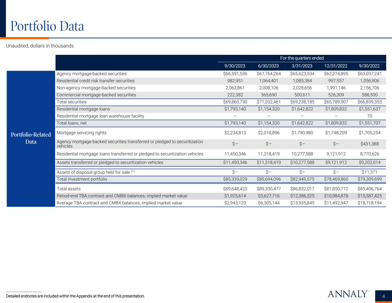 Financial Snapshot 3 Unaudited, dollars in thousands except per share amounts Portfolio Efficiency GAAP Key Statistics Income Statement Balance Sheet For the quarters ended 9/30/2023 6/30/2023 GAAP net income (loss) per average common share (1) ($1.21) $0.27 Earnings available for distribution per average common share *(1) $0.66 $0.72 Annualized GAAP return (loss) on average equity (2) (20.18%) 5.42% Annualized EAD return on average equity* 12.96% 13.22% Book value per common share $18.25 $20.73 GAAP leverage at period-end (3) 7.1x 6.1x Economic leverage at period-end *(3) 6.4x 5.8x GAAP capital ratio at period-end (4) 11.9% 13.3% Economic capital ratio at period-end *(4) 13.1% 14.3% Securities $69,860,730 $71,202,461 Loans, net 1,793,140 1,154,320 Mortgage servicing rights (5) 2,234,813 2,018,896 Assets transferred or pledged to securitization vehicles 11,450,346 11,318,419 Total investment portfolio $85,339,029 $85,694,096 Net interest margin (6) (0.20%) (0.15%) Average yield on interest earning assets (7) 4.49% 4.27% Average GAAP cost of interest bearing liabilities (8) 5.27% 5.00% Net interest spread (0.78%) (0.73%) Net interest margin (excluding PAA) *(6) 1.48% 1.66% Average yield on interest earning assets (excluding PAA) *(7) 4.46% 4.22% Average economic cost of interest bearing liabilities *(8) 3.28% 2.77% Net interest spread (excluding PAA) * 1.18% 1.45% Operating expenses to earnings available for distribution * 11.03% 11.02% Annualized operating expenses as a % of average total assets 0.18% 0.19% Annualized operating expenses as a % of average total equity 1.41% 1.44% Non-GAAP Key Statistics * Represents a non-GAAP financial measure. Detailed endnotes are included within the Appendix at the end of this presentation.