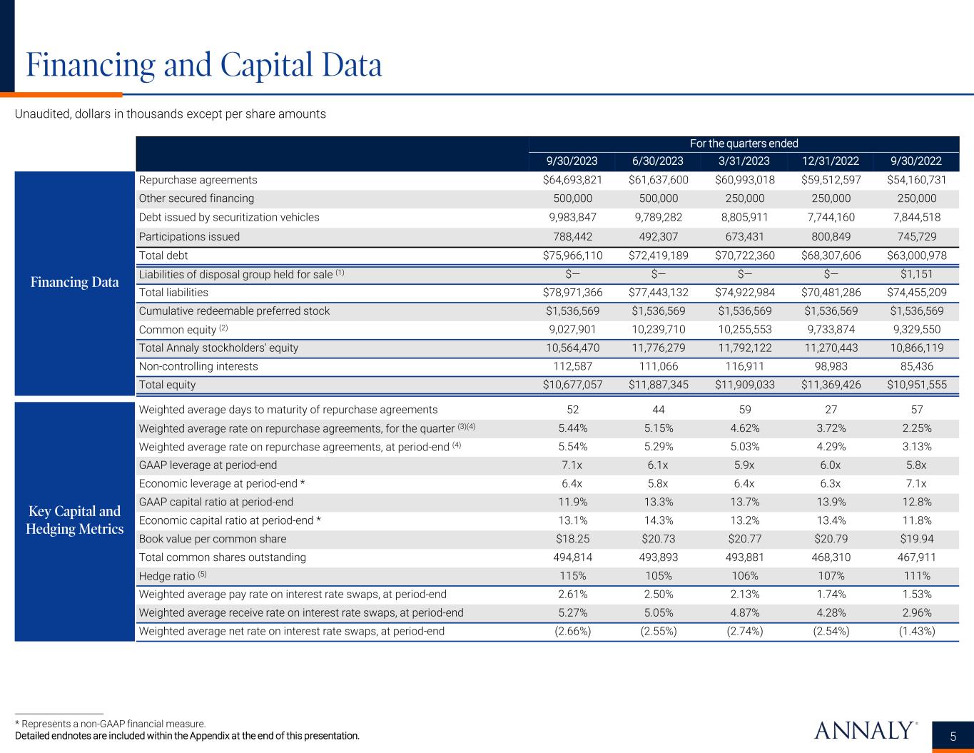 Portfolio Data 4 Unaudited, dollars in thousands Detailed endnotes are included within the Appendix at the end of this presentation. Portfolio-Related Data For the quarters ended 9/30/2023 6/30/2023 3/31/2023 12/31/2022 9/30/2022 Agency mortgage-backed securities $66,591,536 $67,764,264 $65,623,534 $62,274,895 $63,037,241 Residential credit risk transfer securities 982,951 1,064,401 1,085,384 997,557 1,056,906 Non-agency mortgage-backed securities 2,063,861 2,008,106 2,028,656 1,991,146 2,156,706 Commercial mortgage-backed securities 222,382 365,690 500,611 526,309 588,500 Total securities $69,860,730 $71,202,461 $69,238,185 $65,789,907 $66,839,353 Residential mortgage loans $1,793,140 $1,154,320 $1,642,822 $1,809,832 $1,551,637 Residential mortgage loan warehouse facility — — — — 70 Total loans, net $1,793,140 $1,154,320 $1,642,822 $1,809,832 $1,551,707 Mortgage servicing rights $2,234,813 $2,018,896 $1,790,980 $1,748,209 $1,705,254 Agency mortgage-backed securities transferred or pledged to securitization vehicles $— $— $— $— $431,388 Residential mortgage loans transferred or pledged to securitization vehicles 11,450,346 11,318,419 10,277,588 9,121,912 8,770,626 Assets transferred or pledged to securitization vehicles $11,450,346 $11,318,419 $10,277,588 $9,121,912 $9,202,014 Assets of disposal group held for sale (1) $— $— $— $— $11,371 Total investment portfolio $85,339,029 $85,694,096 $82,949,575 $78,469,860 $79,309,699 Total assets $89,648,423 $89,330,477 $86,832,017 $81,850,712 $85,406,764 Period-end TBA contract and CMBX balances, implied market value $1,925,614 $3,627,716 $12,386,325 $10,984,878 $15,587,425 Average TBA contract and CMBX balances, implied market value $2,943,120 $6,305,144 $13,935,845 $11,492,947 $18,718,194