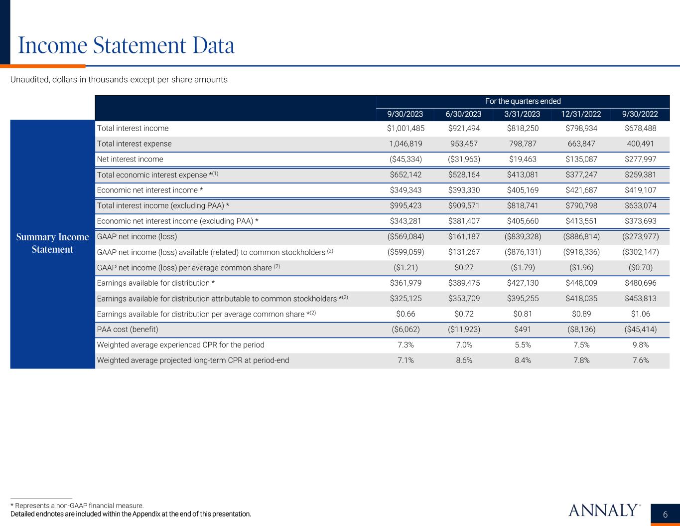 Financing and Capital Data 5 Unaudited, dollars in thousands except per share amounts * Represents a non-GAAP financial measure. Detailed endnotes are included within the Appendix at the end of this presentation. For the quarters ended 9/30/2023 6/30/2023 3/31/2023 12/31/2022 9/30/2022 Repurchase agreements $64,693,821 $61,637,600 $60,993,018 $59,512,597 $54,160,731 Other secured financing 500,000 500,000 250,000 250,000 250,000 Debt issued by securitization vehicles 9,983,847 9,789,282 8,805,911 7,744,160 7,844,518 Participations issued 788,442 492,307 673,431 800,849 745,729 Total debt $75,966,110 $72,419,189 $70,722,360 $68,307,606 $63,000,978 Liabilities of disposal group held for sale (1) $— $— $— $— $1,151 Total liabilities $78,971,366 $77,443,132 $74,922,984 $70,481,286 $74,455,209 Cumulative redeemable preferred stock $1,536,569 $1,536,569 $1,536,569 $1,536,569 $1,536,569 Common equity (2) 9,027,901 10,239,710 10,255,553 9,733,874 9,329,550 Total Annaly stockholders' equity 10,564,470 11,776,279 11,792,122 11,270,443 10,866,119 Non-controlling interests 112,587 111,066 116,911 98,983 85,436 Total equity $10,677,057 $11,887,345 $11,909,033 $11,369,426 $10,951,555 Weighted average days to maturity of repurchase agreements 52 44 59 27 57 Weighted average rate on repurchase agreements, for the quarter (3)(4) 5.44% 5.15% 4.62% 3.72% 2.25% Weighted average rate on repurchase agreements, at period-end (4) 5.54% 5.29% 5.03% 4.29% 3.13% GAAP leverage at period-end 7.1x 6.1x 5.9x 6.0x 5.8x Economic leverage at period-end * 6.4x 5.8x 6.4x 6.3x 7.1x GAAP capital ratio at period-end 11.9% 13.3% 13.7% 13.9% 12.8% Economic capital ratio at period-end * 13.1% 14.3% 13.2% 13.4% 11.8% Book value per common share $18.25 $20.73 $20.77 $20.79 $19.94 Total common shares outstanding 494,814 493,893 493,881 468,310 467,911 Hedge ratio (5) 115% 105% 106% 107% 111% Weighted average pay rate on interest rate swaps, at period-end 2.61% 2.50% 2.13% 1.74% 1.53% Weighted average receive rate on interest rate swaps, at period-end 5.27% 5.05% 4.87% 4.28% 2.96% Weighted average net rate on interest rate swaps, at period-end (2.66%) (2.55%) (2.74%) (2.54%) (1.43%) Financing Data Key Capital and Hedging Metrics