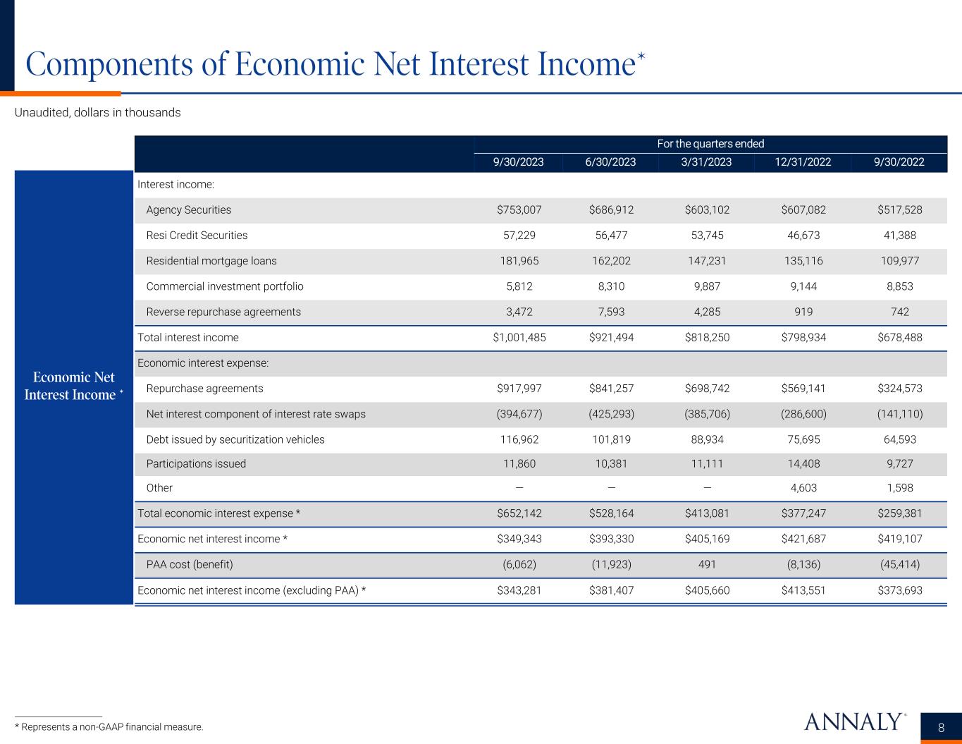 Key Earnings Metrics 7 Unaudited, dollars in thousands except per share amounts * Represents a non-GAAP financial measure. Detailed endnotes are included within the Appendix at the end of this presentation. For the quarters ended 9/30/2023 6/30/2023 3/31/2023 12/31/2022 9/30/2022 Dividends declared per common share $0.65 $0.65 $0.65 $0.88 $0.88 Total common and preferred dividends declared (1) $360,018 $358,214 $354,374 $443,513 $440,033 Annualized GAAP return (loss) on average equity (2) (20.18%) 5.42% (28.84%) (31.78%) (9.94%) Annualized GAAP return (loss) on average equity per unit of GAAP leverage (2.84%) 0.89% (4.89%) (5.30%) (1.71%) Net interest margin (0.20%) (0.15%) 0.09% 0.65% 1.42% Average yield on interest earning assets 4.49% 4.27% 3.96% 3.86% 3.47% Average GAAP cost of interest bearing liabilities 5.27% 5.00% 4.52% 3.71% 2.38% Net interest spread (0.78%) (0.73%) (0.56%) 0.15% 1.09% Annualized EAD return on average equity * 12.96% 13.22% 14.82% 16.19% 17.57% Annualized EAD return on average equity per unit of economic leverage * 2.03% 2.28% 2.32% 2.57% 2.47% Net interest margin (excluding PAA) * 1.48% 1.66% 1.76% 1.90% 1.98% Average yield on interest earning assets (excluding PAA) * 4.46% 4.22% 3.96% 3.82% 3.24% Average economic cost of interest bearing liabilities * 3.28% 2.77% 2.34% 2.11% 1.54% Net interest spread (excluding PAA) * 1.18% 1.45% 1.62% 1.71% 1.70% Key GAAP Earnings Metrics Key Non-GAAP Earnings Metrics