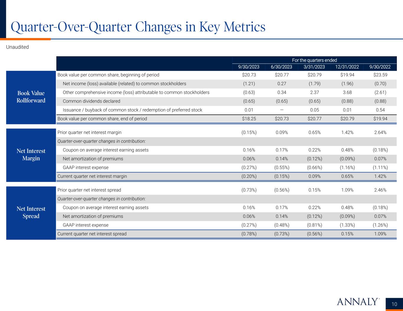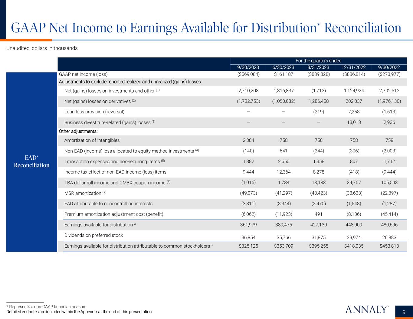 GAAP Net Income to Earnings Available for Distribution* Reconciliation 9 Unaudited, dollars in thousands * Represents a non-GAAP financial measure. Detailed endnotes are included within the Appendix at the end of this presentation. For the quarters ended 9/30/2023 6/30/2023 3/31/2023 12/31/2022 9/30/2022 GAAP net income (loss) ($569,084) $161,187 ($839,328) ($886,814) ($273,977) Adjustments to exclude reported realized and unrealized (gains) losses: Net (gains) losses on investments and other (1) 2,710,208 1,316,837 (1,712) 1,124,924 2,702,512 Net (gains) losses on derivatives (2) (1,732,753) (1,050,032) 1,286,458 202,337 (1,976,130) Loan loss provision (reversal) — — (219) 7,258 (1,613) Business divestiture-related (gains) losses (3) — — — 13,013 2,936 Other adjustments: Amortization of intangibles 2,384 758 758 758 758 Non-EAD (income) loss allocated to equity method investments (4) (140) 541 (244) (306) (2,003) Transaction expenses and non-recurring items (5) 1,882 2,650 1,358 807 1,712 Income tax effect of non-EAD income (loss) items 9,444 12,364 8,278 (418) (9,444) TBA dollar roll income and CMBX coupon income (6) (1,016) 1,734 18,183 34,767 105,543 MSR amortization (7) (49,073) (41,297) (43,423) (38,633) (22,897) EAD attributable to noncontrolling interests (3,811) (3,344) (3,470) (1,548) (1,287) Premium amortization adjustment cost (benefit) (6,062) (11,923) 491 (8,136) (45,414) Earnings available for distribution * 361,979 389,475 427,130 448,009 480,696 Dividends on preferred stock 36,854 35,766 31,875 29,974 26,883 Earnings available for distribution attributable to common stockholders * $325,125 $353,709 $395,255 $418,035 $453,813 EAD* Reconciliation