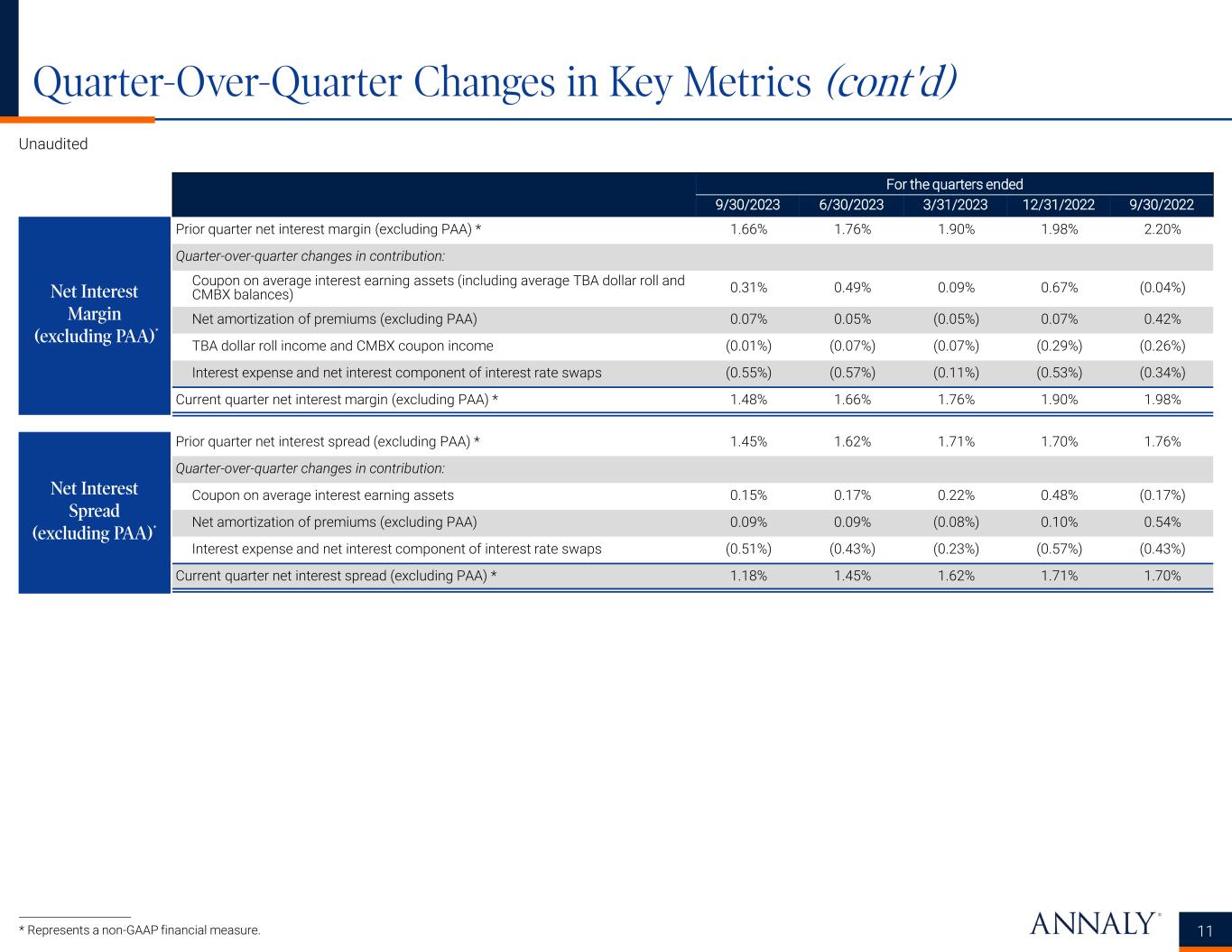 Quarter-Over-Quarter Changes in Key Metrics 10 Unaudited For the quarters ended 9/30/2023 6/30/2023 3/31/2023 12/31/2022 9/30/2022 Book value per common share, beginning of period $20.73 $20.77 $20.79 $19.94 $23.59 Net income (loss) available (related) to common stockholders (1.21) 0.27 (1.79) (1.96) (0.70) Other comprehensive income (loss) attributable to common stockholders (0.63) 0.34 2.37 3.68 (2.61) Common dividends declared (0.65) (0.65) (0.65) (0.88) (0.88) Issuance / buyback of common stock / redemption of preferred stock 0.01 — 0.05 0.01 0.54 Book value per common share, end of period $18.25 $20.73 $20.77 $20.79 $19.94 Prior quarter net interest margin (0.15%) 0.09% 0.65% 1.42% 2.64% Quarter-over-quarter changes in contribution: Coupon on average interest earning assets 0.16% 0.17% 0.22% 0.48% (0.18%) Net amortization of premiums 0.06% 0.14% (0.12%) (0.09%) 0.07% GAAP interest expense (0.27%) (0.55%) (0.66%) (1.16%) (1.11%) Current quarter net interest margin (0.20%) (0.15%) 0.09% 0.65% 1.42% Prior quarter net interest spread (0.73%) (0.56%) 0.15% 1.09% 2.46% Quarter-over-quarter changes in contribution: Coupon on average interest earning assets 0.16% 0.17% 0.22% 0.48% (0.18%) Net amortization of premiums 0.06% 0.14% (0.12%) (0.09%) 0.07% GAAP interest expense (0.27%) (0.48%) (0.81%) (1.33%) (1.26%) Current quarter net interest spread (0.78%) (0.73%) (0.56%) 0.15% 1.09% Book Value Rollforward Net Interest Margin Net Interest Spread