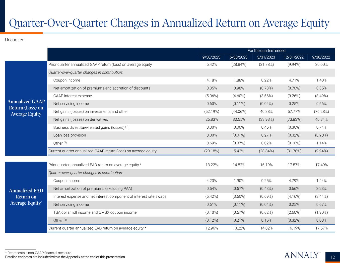 Quarter-Over-Quarter Changes in Key Metrics (cont'd) 11 Unaudited * Represents a non-GAAP financial measure. For the quarters ended 9/30/2023 6/30/2023 3/31/2023 12/31/2022 9/30/2022 Prior quarter net interest margin (excluding PAA) * 1.66% 1.76% 1.90% 1.98% 2.20% Quarter-over-quarter changes in contribution: Coupon on average interest earning assets (including average TBA dollar roll and CMBX balances) 0.31% 0.49% 0.09% 0.67% (0.04%) Net amortization of premiums (excluding PAA) 0.07% 0.05% (0.05%) 0.07% 0.42% TBA dollar roll income and CMBX coupon income (0.01%) (0.07%) (0.07%) (0.29%) (0.26%) Interest expense and net interest component of interest rate swaps (0.55%) (0.57%) (0.11%) (0.53%) (0.34%) Current quarter net interest margin (excluding PAA) * 1.48% 1.66% 1.76% 1.90% 1.98% Prior quarter net interest spread (excluding PAA) * 1.45% 1.62% 1.71% 1.70% 1.76% Quarter-over-quarter changes in contribution: Coupon on average interest earning assets 0.15% 0.17% 0.22% 0.48% (0.17%) Net amortization of premiums (excluding PAA) 0.09% 0.09% (0.08%) 0.10% 0.54% Interest expense and net interest component of interest rate swaps (0.51%) (0.43%) (0.23%) (0.57%) (0.43%) Current quarter net interest spread (excluding PAA) * 1.18% 1.45% 1.62% 1.71% 1.70% Net Interest Margin (excluding PAA)* Net Interest Spread (excluding PAA)*