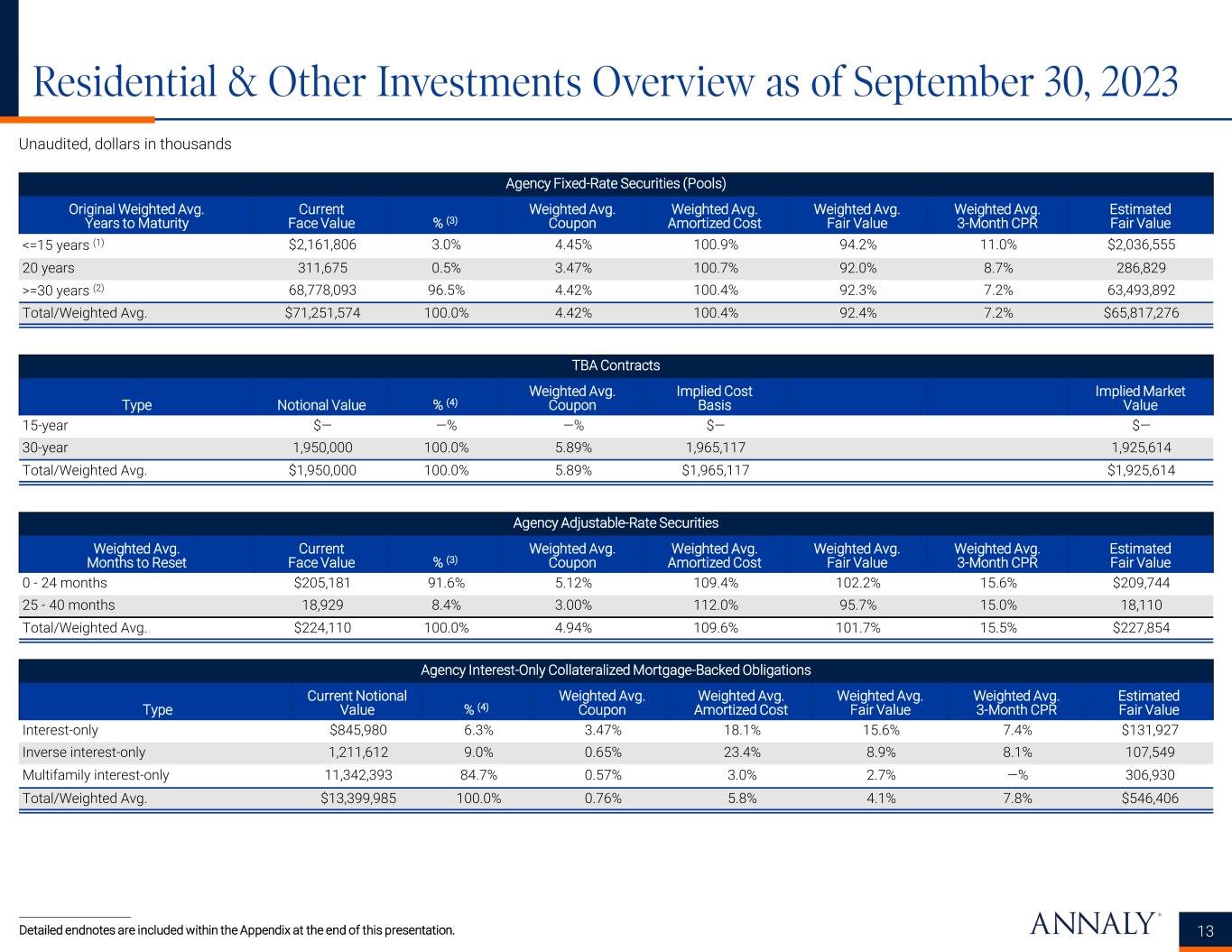 Quarter-Over-Quarter Changes in Annualized Return on Average Equity 12 Unaudited * Represents a non-GAAP financial measure. Detailed endnotes are included within the Appendix at the end of this presentation. For the quarters ended 9/30/2023 6/30/2023 3/31/2023 12/31/2022 9/30/2022 Prior quarter annualized GAAP return (loss) on average equity 5.42% (28.84%) (31.78%) (9.94%) 30.60% Quarter-over-quarter changes in contribution: Coupon income 4.18% 1.88% 0.22% 4.71% 1.40% Net amortization of premiums and accretion of discounts 0.35% 0.98% (0.73%) (0.70%) 0.35% GAAP interest expense (5.06%) (4.60%) (3.66%) (9.26%) (8.49%) Net servicing income 0.60% (0.11%) (0.04%) 0.25% 0.66% Net gains (losses) on investments and other (52.19%) (44.06%) 40.38% 57.77% (76.28%) Net gains (losses) on derivatives 25.83% 80.55% (33.98%) (73.83%) 40.84% Business divestiture-related gains (losses) (1) 0.00% 0.00% 0.46% (0.36%) 0.74% Loan loss provision 0.00% (0.01%) 0.27% (0.32%) (0.90%) Other (2) 0.69% (0.37%) 0.02% (0.10%) 1.14% Current quarter annualized GAAP return (loss) on average equity (20.18%) 5.42% (28.84%) (31.78%) (9.94%) Prior quarter annualized EAD return on average equity * 13.22% 14.82% 16.19% 17.57% 17.49% Quarter-over-quarter changes in contribution: Coupon income 4.23% 1.90% 0.25% 4.79% 1.44% Net amortization of premiums (excluding PAA) 0.54% 0.57% (0.43%) 0.66% 3.23% Interest expense and net interest component of interest rate swaps (5.42%) (3.60%) (0.69%) (4.16%) (3.44%) Net servicing income 0.61% (0.11%) (0.04%) 0.25% 0.67% TBA dollar roll income and CMBX coupon income (0.10%) (0.57%) (0.62%) (2.60%) (1.90%) Other (3) (0.12%) 0.21% 0.16% (0.32%) 0.08% Current quarter annualized EAD return on average equity * 12.96% 13.22% 14.82% 16.19% 17.57% Annualized GAAP Return (Loss) on Average Equity Annualized EAD Return on Average Equity*