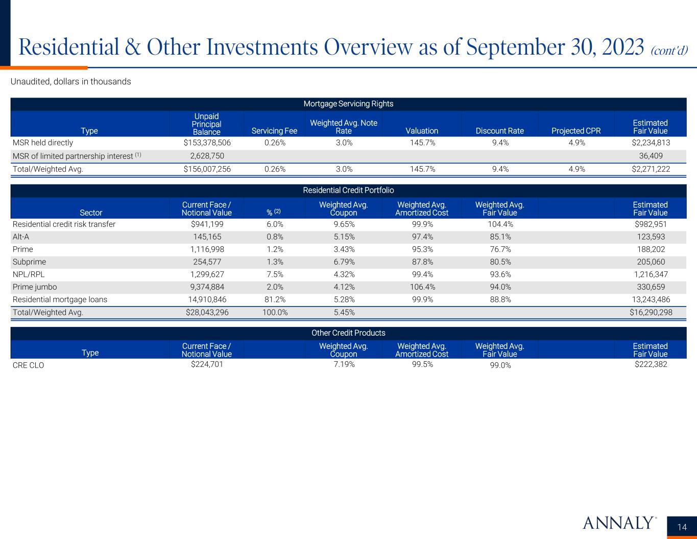 Residential & Other Investments Overview as of September 30, 2023 13 Unaudited, dollars in thousands Detailed endnotes are included within the Appendix at the end of this presentation. Agency Fixed-Rate Securities (Pools) Original Weighted Avg. Years to Maturity Current Face Value % (3) Weighted Avg. Coupon Weighted Avg. Amortized Cost Weighted Avg. Fair Value Weighted Avg. 3-Month CPR Estimated Fair Value <=15 years (1) $2,161,806 3.0% 4.45% 100.9% 94.2% 11.0% $2,036,555 20 years 311,675 0.5% 3.47% 100.7% 92.0% 8.7% 286,829 >=30 years (2) 68,778,093 96.5% 4.42% 100.4% 92.3% 7.2% 63,493,892 Total/Weighted Avg. $71,251,574 100.0% 4.42% 100.4% 92.4% 7.2% $65,817,276 TBA Contracts Type Notional Value % (4) Weighted Avg. Coupon Implied Cost Basis Implied Market Value 15-year $— —% —% $— $— 30-year 1,950,000 100.0% 5.89% 1,965,117 1,925,614 Total/Weighted Avg. $1,950,000 100.0% 5.89% $1,965,117 $1,925,614 Agency Adjustable-Rate Securities Weighted Avg. Months to Reset Current Face Value % (3) Weighted Avg. Coupon Weighted Avg. Amortized Cost Weighted Avg. Fair Value Weighted Avg. 3-Month CPR Estimated Fair Value 0 - 24 months $205,181 91.6% 5.12% 109.4% 102.2% 15.6% $209,744 25 - 40 months 18,929 8.4% 3.00% 112.0% 95.7% 15.0% 18,110 Total/Weighted Avg. $224,110 100.0% 4.94% 109.6% 101.7% 15.5% $227,854 Agency Interest-Only Collateralized Mortgage-Backed Obligations Type Current Notional Value % (4) Weighted Avg. Coupon Weighted Avg. Amortized Cost Weighted Avg. Fair Value Weighted Avg. 3-Month CPR Estimated Fair Value Interest-only $845,980 6.3% 3.47% 18.1% 15.6% 7.4% $131,927 Inverse interest-only 1,211,612 9.0% 0.65% 23.4% 8.9% 8.1% 107,549 Multifamily interest-only 11,342,393 84.7% 0.57% 3.0% 2.7% —% 306,930 Total/Weighted Avg. $13,399,985 100.0% 0.76% 5.8% 4.1% 7.8% $546,406
