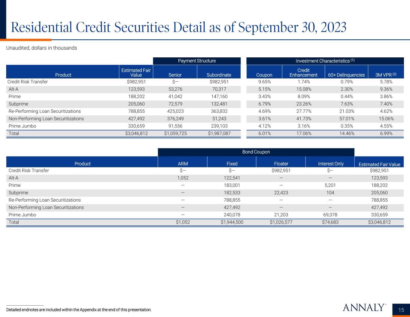 Residential & Other Investments Overview as of September 30, 2023 (cont'd) 14 Unaudited, dollars in thousands Mortgage Servicing Rights Type Unpaid Principal Balance Servicing Fee Weighted Avg. Note Rate Valuation Discount Rate Projected CPR Estimated Fair Value MSR held directly $153,378,506 0.26% 3.0% 145.7% 9.4% 4.9% $2,234,813 MSR of limited partnership interest (1) 2,628,750 36,409 Total/Weighted Avg. $156,007,256 0.26% 3.0% 145.7% 9.4% 4.9% $2,271,222 Residential Credit Portfolio Sector Current Face / Notional Value % (2) Weighted Avg. Coupon Weighted Avg. Amortized Cost Weighted Avg. Fair Value Estimated Fair Value Residential credit risk transfer $941,199 6.0% 9.65% 99.9% 104.4% $982,951 Alt-A 145,165 0.8% 5.15% 97.4% 85.1% 123,593 Prime 1,116,998 1.2% 3.43% 95.3% 76.7% 188,202 Subprime 254,577 1.3% 6.79% 87.8% 80.5% 205,060 NPL/RPL 1,299,627 7.5% 4.32% 99.4% 93.6% 1,216,347 Prime jumbo 9,374,884 2.0% 4.12% 106.4% 94.0% 330,659 Residential mortgage loans 14,910,846 81.2% 5.28% 99.9% 88.8% 13,243,486 Total/Weighted Avg. $28,043,296 100.0% 5.45% $16,290,298 Other Credit Products Type Current Face / Notional Value Weighted Avg. Coupon Weighted Avg. Amortized Cost Weighted Avg. Fair Value Estimated Fair Value CRE CLO $224,701 7.19% 99.5% 99.0% $222,382