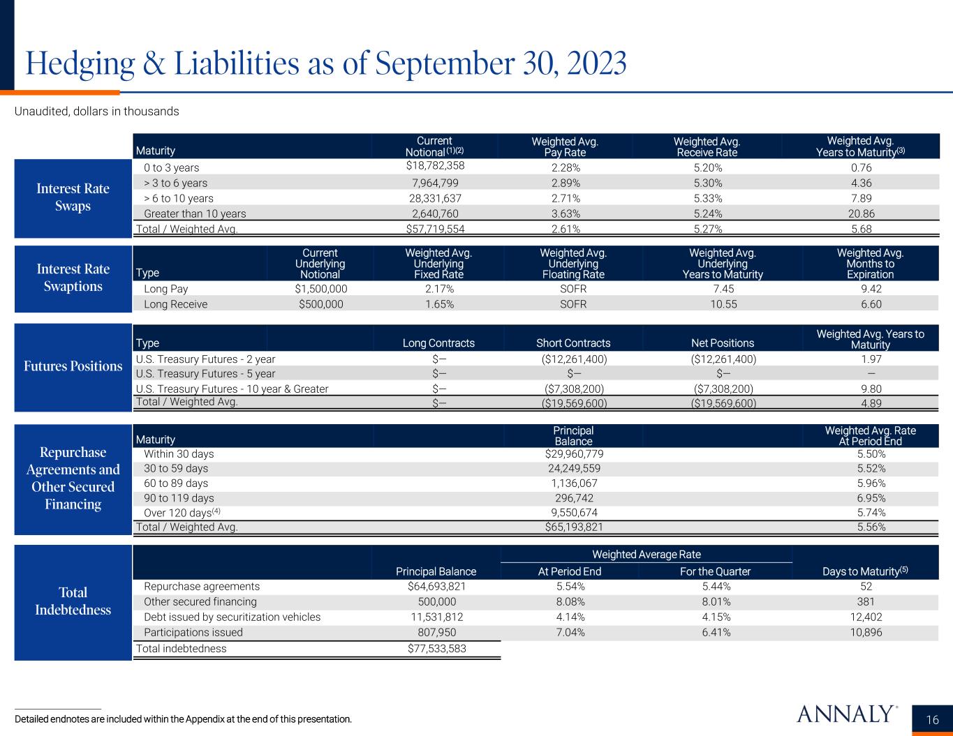 Residential Credit Securities Detail as of September 30, 2023 15 Unaudited, dollars in thousands Payment Structure Investment Characteristics (1) Product Estimated Fair Value Senior Subordinate Coupon Credit Enhancement 60+ Delinquencies 3M VPR (2) Credit Risk Transfer $982,951 $— $982,951 9.65% 1.74% 0.79% 5.78% Alt-A 123,593 53,276 70,317 5.15% 15.08% 2.30% 9.36% Prime 188,202 41,042 147,160 3.43% 8.09% 0.44% 3.86% Subprime 205,060 72,579 132,481 6.79% 23.26% 7.63% 7.40% Re-Performing Loan Securitizations 788,855 425,023 363,832 4.69% 27.77% 21.03% 4.62% Non-Performing Loan Securitizations 427,492 376,249 51,243 3.61% 41.73% 57.01% 15.06% Prime Jumbo 330,659 91,556 239,103 4.12% 3.16% 0.35% 4.55% Total $3,046,812 $1,059,725 $1,987,087 6.01% 17.06% 14.46% 6.99% Bond Coupon Product ARM Fixed Floater Interest Only Estimated Fair Value Credit Risk Transfer $— $— $982,951 $— $982,951 Alt-A 1,052 122,541 — — 123,593 Prime — 183,001 — 5,201 188,202 Subprime — 182,533 22,423 104 205,060 Re-Performing Loan Securitizations — 788,855 — — 788,855 Non-Performing Loan Securitizations — 427,492 — — 427,492 Prime Jumbo — 240,078 21,203 69,378 330,659 Total $1,052 $1,944,500 $1,026,577 $74,683 $3,046,812 Detailed endnotes are included within the Appendix at the end of this presentation.