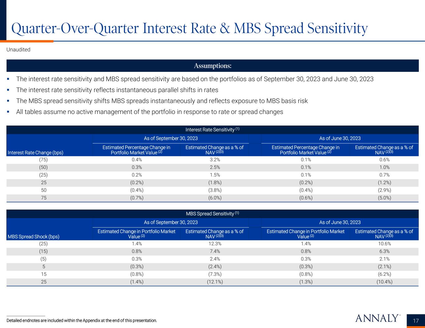 Quarter-Over-Quarter Interest Rate & MBS Spread Sensitivity  The interest rate sensitivity and MBS spread sensitivity are based on the portfolios as of September 30, 2023 and June 30, 2023  The interest rate sensitivity reflects instantaneous parallel shifts in rates  The MBS spread sensitivity shifts MBS spreads instantaneously and reflects exposure to MBS basis risk  All tables assume no active management of the portfolio in response to rate or spread changes 17 Unaudited Assumptions: Interest Rate Sensitivity (1) Interest Rate Change (bps) As of September 30, 2023 As of June 30, 2023 Estimated Percentage Change in Portfolio Market Value (2) Estimated Change as a % of NAV (2)(3) Estimated Percentage Change in Portfolio Market Value (2) Estimated Change as a % of NAV (2)(3) (75) 0.4% 3.2% 0.1% 0.6% (50) 0.3% 2.5% 0.1% 1.0% (25) 0.2% 1.5% 0.1% 0.7% 25 (0.2%) (1.8%) (0.2%) (1.2%) 50 (0.4%) (3.8%) (0.4%) (2.9%) 75 (0.7%) (6.0%) (0.6%) (5.0%) MBS Spread Sensitivity (1) MBS Spread Shock (bps) As of September 30, 2023 As of June 30, 2023 Estimated Change in Portfolio Market Value (2) Estimated Change as a % of NAV (2)(3) Estimated Change in Portfolio Market Value (2) Estimated Change as a % of NAV (2)(3) (25) 1.4% 12.3% 1.4% 10.6% (15) 0.8% 7.4% 0.8% 6.3% (5) 0.3% 2.4% 0.3% 2.1% 5 (0.3%) (2.4%) (0.3%) (2.1%) 15 (0.8%) (7.3%) (0.8%) (6.2%) 25 (1.4%) (12.1%) (1.3%) (10.4%) Detailed endnotes are included within the Appendix at the end of this presentation.