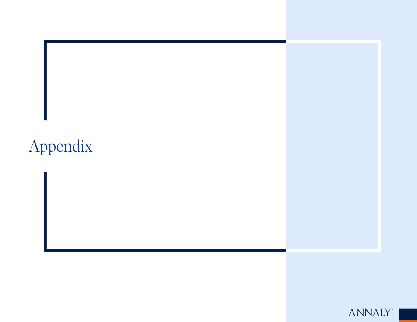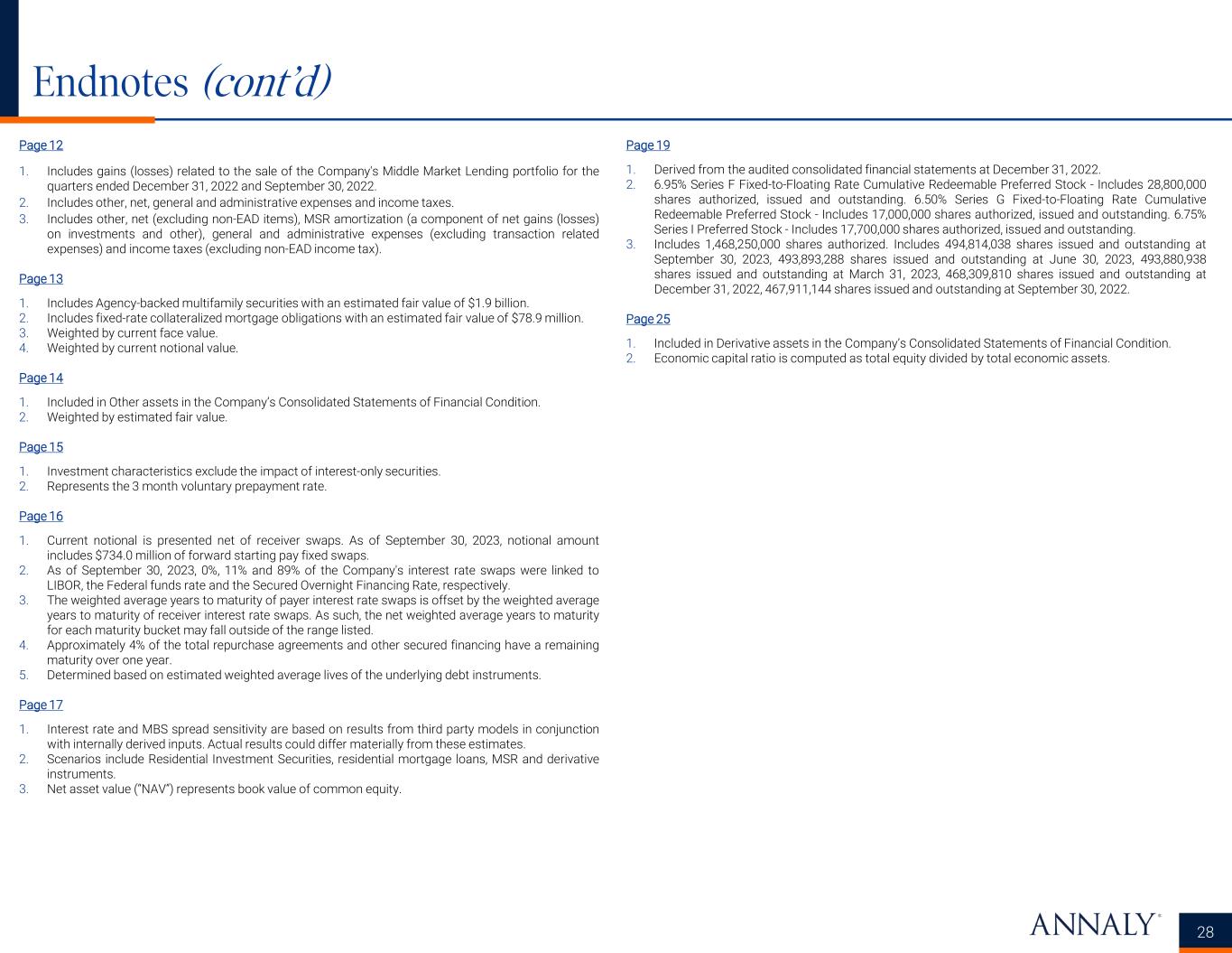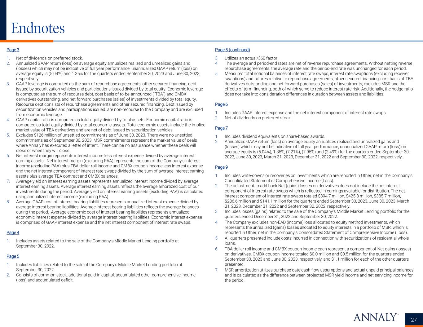 Endnotes 27 Page 3 1. Net of dividends on preferred stock. 2. Annualized GAAP return (loss) on average equity annualizes realized and unrealized gains and (losses) which may not be indicative of full year performance, unannualized GAAP return (loss) on average equity is (5.04%) and 1.35% for the quarters ended September 30, 2023 and June 30, 2023, respectively. 3. GAAP leverage is computed as the sum of repurchase agreements, other secured financing, debt issued by securitization vehicles and participations issued divided by total equity. Economic leverage is computed as the sum of recourse debt, cost basis of to-be-announced ("TBA") and CMBX derivatives outstanding, and net forward purchases (sales) of investments divided by total equity. Recourse debt consists of repurchase agreements and other secured financing. Debt issued by securitization vehicles and participations issued are non-recourse to the Company and are excluded from economic leverage. 4. GAAP capital ratio is computed as total equity divided by total assets. Economic capital ratio is computed as total equity divided by total economic assets. Total economic assets include the implied market value of TBA derivatives and are net of debt issued by securitization vehicles. 5. Excludes $126 million of unsettled commitments as of June 30, 2023. There were no unsettled commitments as of September 30, 2023. MSR commitments represent the market value of deals where Annaly has executed a letter of intent. There can be no assurance whether these deals will close or when they will close. 6. Net interest margin represents interest income less interest expense divided by average interest earning assets. Net interest margin (excluding PAA) represents the sum of the Company's interest income (excluding PAA) plus TBA dollar roll income and CMBX coupon income less interest expense and the net interest component of interest rate swaps divided by the sum of average interest earning assets plus average TBA contract and CMBX balances. 7. Average yield on interest earning assets represents annualized interest income divided by average interest earning assets. Average interest earning assets reflects the average amortized cost of our investments during the period. Average yield on interest earning assets (excluding PAA) is calculated using annualized interest income (excluding PAA). 8. Average GAAP cost of interest bearing liabilities represents annualized interest expense divided by average interest bearing liabilities. Average interest bearing liabilities reflects the average balances during the period. Average economic cost of interest bearing liabilities represents annualized economic interest expense divided by average interest bearing liabilities. Economic interest expense is comprised of GAAP interest expense and the net interest component of interest rate swaps. Page 4 1. Includes assets related to the sale of the Company's Middle Market Lending portfolio at September 30, 2022. Page 5 1. Includes liabilities related to the sale of the Company's Middle Market Lending portfolio at September 30, 2022. 2. Consists of common stock, additional paid-in capital, accumulated other comprehensive income (loss) and accumulated deficit. Page 5 (continued) 3. Utilizes an actual/360 factor. 4. The average and period-end rates are net of reverse repurchase agreements. Without netting reverse repurchase agreements, the average rate and the period-end rate was unchanged for each period. 5. Measures total notional balances of interest rate swaps, interest rate swaptions (excluding receiver swaptions) and futures relative to repurchase agreements, other secured financing, cost basis of TBA derivatives outstanding and net forward purchases (sales) of investments; excludes MSR and the effects of term financing, both of which serve to reduce interest rate risk. Additionally, the hedge ratio does not take into consideration differences in duration between assets and liabilities. Page 6 1. Includes GAAP interest expense and the net interest component of interest rate swaps. 2. Net of dividends on preferred stock. Page 7 1. Includes dividend equivalents on share-based awards. 2. Annualized GAAP return (loss) on average equity annualizes realized and unrealized gains and (losses) which may not be indicative of full year performance, unannualized GAAP return (loss) on average equity is (5.04%), 1.35%, (7.21%), (7.95%) and (2.49%) for the quarters ended September 30, 2023, June 30, 2023, March 31, 2023, December 31, 2022 and September 30, 2022, respectively. Page 9 1. Includes write-downs or recoveries on investments which are reported in Other, net in the Company's Consolidated Statement of Comprehensive Income (Loss). 2. The adjustment to add back Net (gains) losses on derivatives does not include the net interest component of interest rate swaps which is reflected in earnings available for distribution. The net interest component of interest rate swaps totaled $394.7 million, $425.3 million, $385.7 million, $286.6 million and $141.1 million for the quarters ended September 30, 2023, June 30, 2023, March 31, 2023, December 31, 2022 and September 30, 2022, respectively. 3. Includes losses (gains) related to the sale of the Company's Middle Market Lending portfolio for the quarters ended December 31, 2022 and September 30, 2022. 4. The Company excludes non-EAD (income) loss allocated to equity method investments, which represents the unrealized (gains) losses allocated to equity interests in a portfolio of MSR, which is reported in Other, net in the Company’s Consolidated Statement of Comprehensive Income (Loss). 5. All quarters presented include costs incurred in connection with securitizations of residential whole loans. 6. TBA dollar roll income and CMBX coupon income each represent a component of Net gains (losses) on derivatives. CMBX coupon income totaled $0.0 million and $0.5 million for the quarters ended September 30, 2023 and June 30, 2023, respectively, 