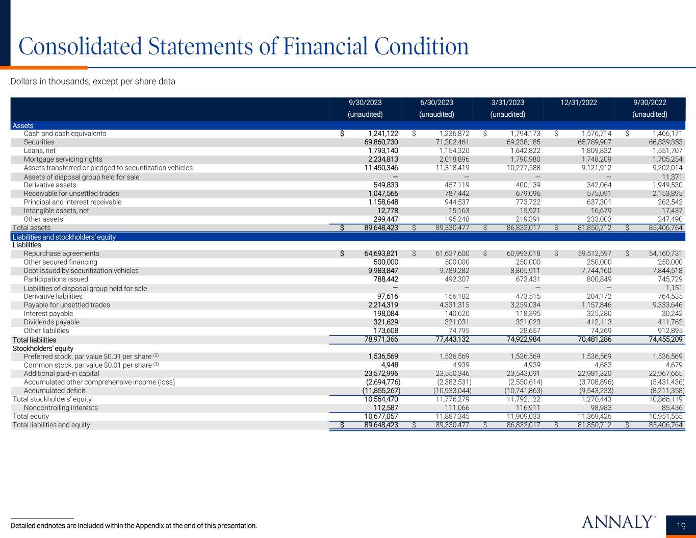 Consolidated Statements of Financial Condition 19 Dollars in thousands, except per share data 9/30/2023 6/30/2023 3/31/2023 12/31/2022 9/30/2022 (unaudited) (unaudited) (unaudited) (unaudited) Assets Cash and cash equivalents $ 1,241,122 $ 1,236,872 $ 1,794,173 $ 1,576,714 $ 1,466,171 Securities 69,860,730 71,202,461 69,238,185 65,789,907 66,839,353 Loans, net 1,793,140 1,154,320 1,642,822 1,809,832 1,551,707 Mortgage servicing rights 2,234,813 2,018,896 1,790,980 1,748,209 1,705,254 Assets transferred or pledged to securitization vehicles 11,450,346 11,318,419 10,277,588 9,121,912 9,202,014 Assets of disposal group held for sale — — — — 11,371 Derivative assets 549,833 457,119 400,139 342,064 1,949,530 Receivable for unsettled trades 1,047,566 787,442 679,096 575,091 2,153,895 Principal and interest receivable 1,158,648 944,537 773,722 637,301 262,542 Intangible assets, net 12,778 15,163 15,921 16,679 17,437 Other assets 299,447 195,248 219,391 233,003 247,490 Total assets $ 89,648,423 $ 89,330,477 $ 86,832,017 $ 81,850,712 $ 85,406,764 Liabilities and stockholders’ equity Liabilities Repurchase agreements $ 64,693,821 $ 61,637,600 $ 60,993,018 $ 59,512,597 $ 54,160,731 Other secured financing 500,000 500,000 250,000 250,000 250,000 Debt issued by securitization vehicles 9,983,847 9,789,282 8,805,911 7,744,160 7,844,518 Participations issued 788,442 492,307 673,431 800,849 745,729 Liabilities of disposal group held for sale — — — — 1,151 Derivative liabilities 97,616 156,182 473,515 204,172 764,535 Payable for unsettled trades 2,214,319 4,331,315 3,259,034 1,157,846 9,333,646 Interest payable 198,084 140,620 118,395 325,280 30,242 Dividends payable 321,629 321,031 321,023 412,113 411,762 Other liabilities 173,608 74,795 28,657 74,269 912,895 Total liabilities 78,971,366 77,443,132 74,922,984 70,481,286 74,455,209 Stockholders’ equity Preferred stock, par value $0.01 per share (2) 1,536,569 1,536,569 1,536,569 1,536,569 1,536,569 Common stock, par value $0.01 per share (3) 4,948 4,939 4,939 4,683 4,679 Additional paid-in capital 23,572,996 23,550,346 23,543,091 22,981,320 22,967,665 Accumulated other comprehensive income (loss) (2,694,776) (2,382,531) (2,550,614) (3,708,896) (5,431,436) Accumulated deficit (11,855,267) (10,933,044) (10,741,863) (9,543,233) (8,211,358) Total stockholders’ equity 10,564,470 11,776,279 11,792,122 11,270,443 10,866,119 Noncontrolling interests 112,587 111,066 116,911 98,983 85,436 Total equity 10,677,057 11,887,345 11,909,033 11,369,426 10,951,555 Total liabilities and equity $ 89,648,423 $ 89,330,477 $ 86,832,017 $ 81,850,712 $ 85,406,764 Detailed endnotes are included within the Appendix at the end of this presentation.