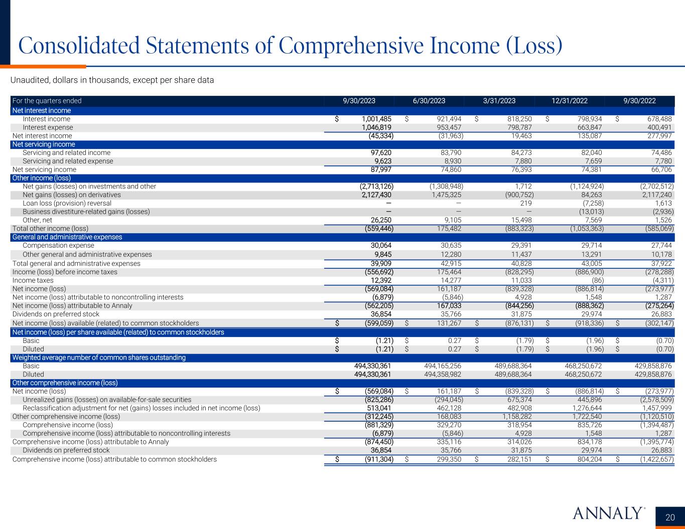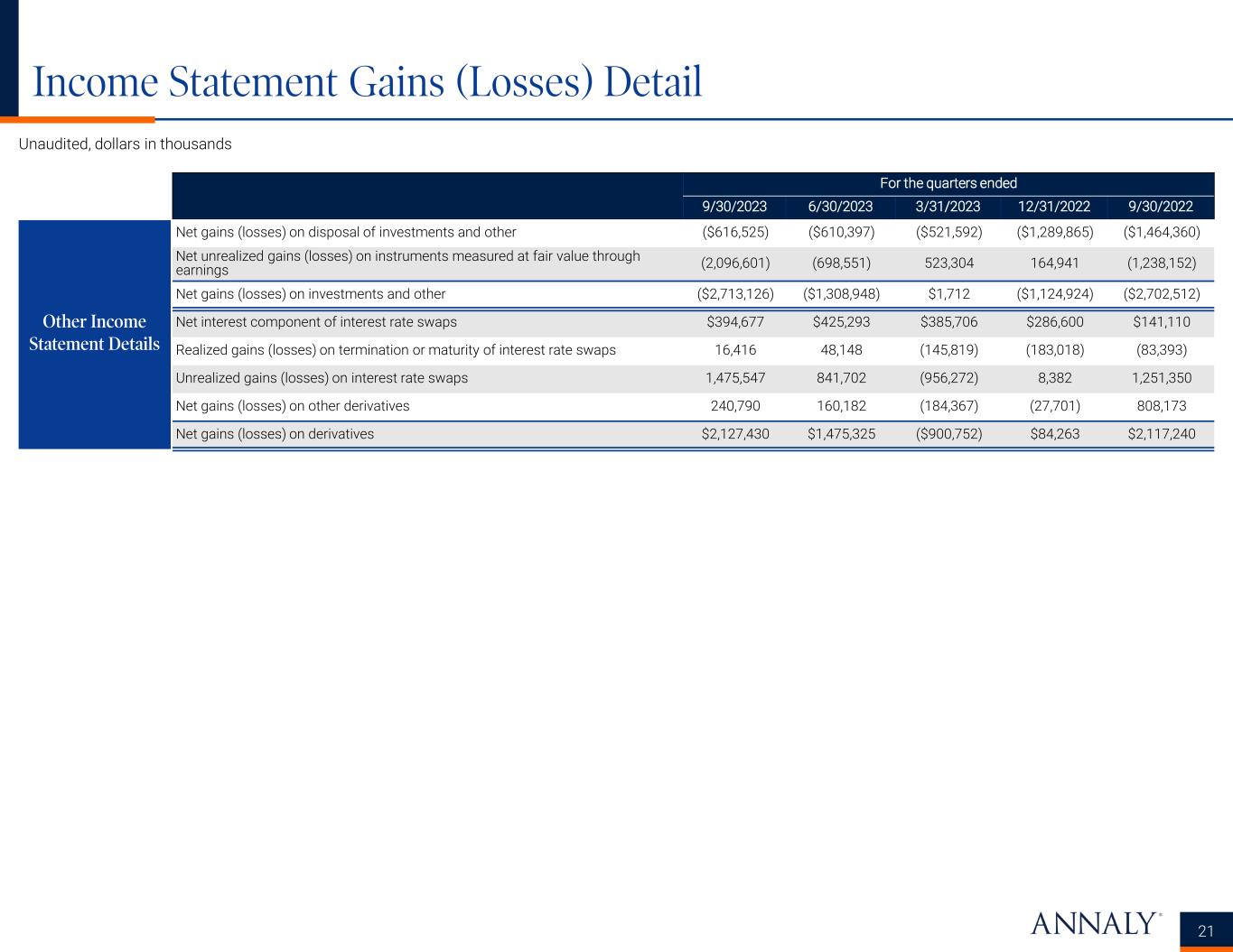 Consolidated Statements of Comprehensive Income (Loss) 20 Unaudited, dollars in thousands, except per share data For the quarters ended 9/30/2023 6/30/2023 3/31/2023 12/31/2022 9/30/2022 Net interest income Interest income $ 1,001,485 $ 921,494 $ 818,250 $ 798,934 $ 678,488 Interest expense 1,046,819 953,457 798,787 663,847 400,491 Net interest income (45,334) (31,963) 19,463 135,087 277,997 Net servicing income Servicing and related income 97,620 83,790 84,273 82,040 74,486 Servicing and related expense 9,623 8,930 7,880 7,659 7,780 Net servicing income 87,997 74,860 76,393 74,381 66,706 Other income (loss) Net gains (losses) on investments and other (2,713,126) (1,308,948) 1,712 (1,124,924) (2,702,512) Net gains (losses) on derivatives 2,127,430 1,475,325 (900,752) 84,263 2,117,240 Loan loss (provision) reversal — — 219 (7,258) 1,613 Business divestiture-related gains (losses) — — — (13,013) (2,936) Other, net 26,250 9,105 15,498 7,569 1,526 Total other income (loss) (559,446) 175,482 (883,323) (1,053,363) (585,069) General and administrative expenses Compensation expense 30,064 30,635 29,391 29,714 27,744 Other general and administrative expenses 9,845 12,280 11,437 13,291 10,178 Total general and administrative expenses 39,909 42,915 40,828 43,005 37,922 Income (loss) before income taxes (556,692) 175,464 (828,295) (886,900) (278,288) Income taxes 12,392 14,277 11,033 (86) (4,311) Net income (loss) (569,084) 161,187 (839,328) (886,814) (273,977) Net income (loss) attributable to noncontrolling interests (6,879) (5,846) 4,928 1,548 1,287 Net income (loss) attributable to Annaly (562,205) 167,033 (844,256) (888,362) (275,264) Dividends on preferred stock 36,854 35,766 31,875 29,974 26,883 Net income (loss) available (related) to common stockholders $ (599,059) $ 131,267 $ (876,131) $ (918,336) $ (302,147) Net income (loss) per share available (related) to common stockholders Basic $ (1.21) $ 0.27 $ (1.79) $ (1.96) $ (0.70) Diluted $ (1.21) $ 0.27 $ (1.79) $ (1.96) $ (0.70) Weighted average number of common shares outstanding Basic 494,330,361 494,165,256 489,688,364 468,250,672 429,858,876 Diluted 494,330,361 494,358,982 489,688,364 468,250,672 429,858,876 Other comprehensive income (loss) Net income (loss) $ (569,084) $ 161,187 $ (839,328) $ (886,814) $ (273,977) Unrealized gains (losses) on available-for-sale securities (825,286) (294,045) 675,374 445,896 (2,578,509) Reclassification adjustment for net (gains) losses included in net income (loss) 513,041 462,128 482,908 1,276,644 1,457,999 Other comprehensive income (loss) (312,245) 168,083 1,158,282 1,722,540 (1,120,510) Comprehensive income (loss) (881,329) 329,270 318,954 835,726 (1,394,487) Comprehensive income (loss) attributable to noncontrolling interests (6,879) (5,846) 4,928 1,548 1,287 Comprehensive income (loss) attributable to Annaly (874,450) 335,116 314,026 834,178 (1,395,774) Dividends on preferred stock 36,854 35,766 31,875 29,974 26,883 Comprehensive income (loss) attributable to common stockholders $ (911,304) $ 299,350 $ 282,151 $ 804,204 $ (1,422,657)