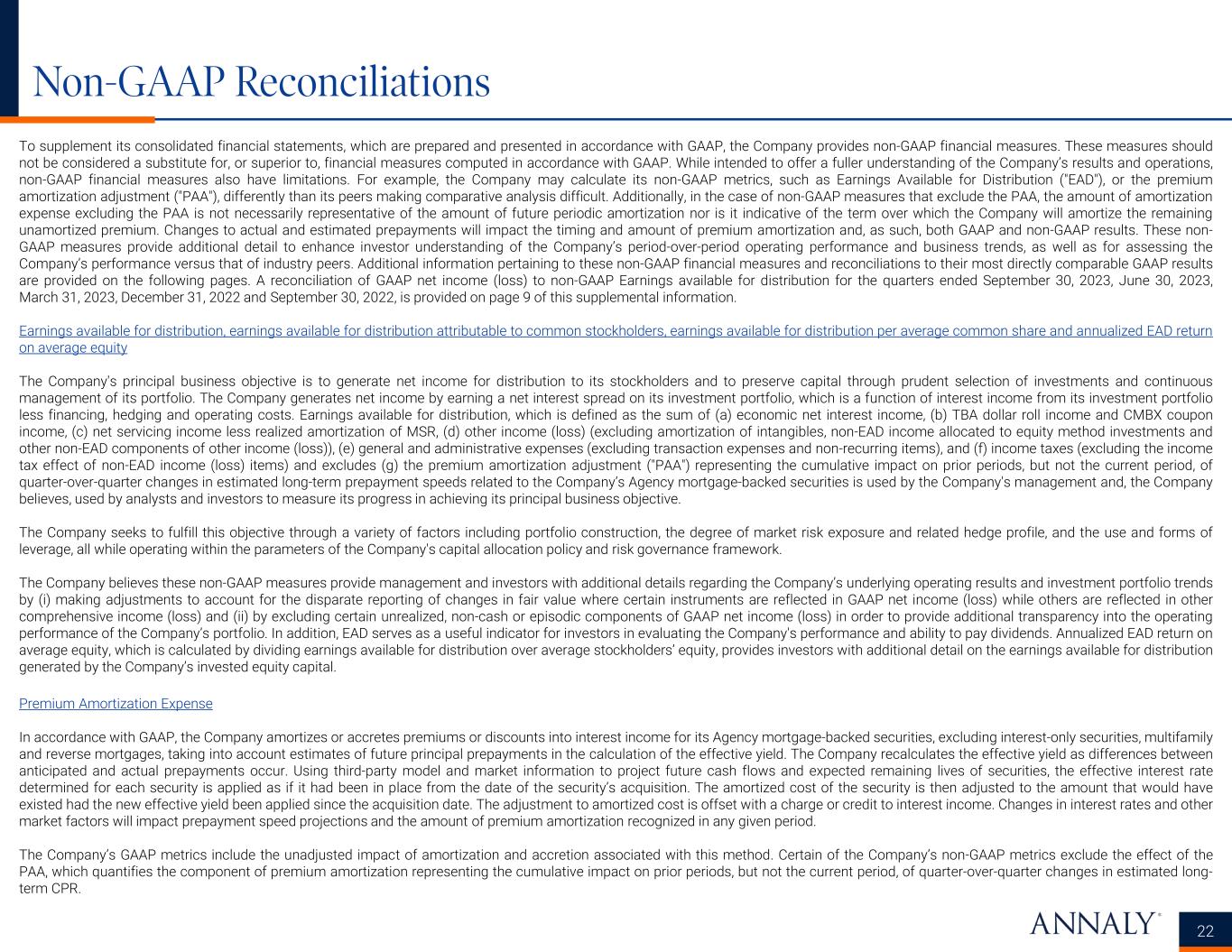 Non-GAAP Reconciliations 22 To supplement its consolidated financial statements, which are prepared and presented in accordance with GAAP, the Company provides non-GAAP financial measures. These measures should not be considered a substitute for, or superior to, financial measures computed in accordance with GAAP. While intended to offer a fuller understanding of the Company’s results and operations, non-GAAP financial measures also have limitations. For example, the Company may calculate its non-GAAP metrics, such as Earnings Available for Distribution ("EAD"), or the premium amortization adjustment ("PAA"), differently than its peers making comparative analysis difficult. Additionally, in the case of non-GAAP measures that exclude the PAA, the amount of amortization expense excluding the PAA is not necessarily representative of the amount of future periodic amortization nor is it indicative of the term over which the Company will amortize the remaining unamortized premium. Changes to actual and estimated prepayments will impact the timing and amount of premium amortization and, as such, both GAAP and non-GAAP results. These non- GAAP measures provide additional detail to enhance investor understanding of the Company’s period-over-period operating performance and business trends, as well as for assessing the Company’s performance versus that of industry peers. Additional information pertaining to these non-GAAP financial measures and reconciliations to their most directly comparable GAAP results are provided on the following pages. A reconciliation of GAAP net income (loss) to non-GAAP Earnings available for distribution for the quarters ended September 30, 2023, June 30, 2023, March 31, 2023, December 31, 2022 and September 30, 2022, is provided on page 9 of this supplemental information. Earnings available for distribution, earnings available for distribution attributable to common stockholders, earnings available for distribution per average common share and annualized EAD return on average equity The Company's principal business objective is to generate net income for distribution to its stockholders and to preserve capital through prudent selection of investments and continuous management of its portfolio. The Company generates net income by earning a net interest spread on its investment portfolio, which is a function of interest income from its investment portfolio less financing, hedging and operating costs. Earnings available for distribution, which is defined as the sum of (a) economic net interest income, (b) TBA dollar roll income and CMBX coupon income, (c) net servicing income less realized amortization of MSR, (d) other income (loss) (excluding amortization of intangibles, non-EAD income allocated to equity method investments and other non-EAD components of other income (loss)), (e) general and administrative expenses (excluding transaction expenses and non-recurring items), and (f) income taxes (excluding the income tax effect of non-EAD income (loss) items) and excludes (g) the premium amortization adjustment ("PAA") representing the cumulative impact on prior periods, but not the current period, of quarter-over-quarter changes in estimated long-term prepayment speeds related to the Company’s Agency mortgage-backed securities is used by the Company's management and, the Company believes, used by analysts and investors to measure its progress in achieving its principal business objective. The Company seeks to fulfill this objective through a variety of factors including portfolio construction, the degree of market risk exposure and related hedge profile, and the use and forms of leverage, all while operating within the parameters of the Company's capital allocation policy and risk governance framework. The Company believes these non-GAAP measures provide management and investors with additional details regarding the Company’s underlying operating results and investment portfolio trends by (i) making adjustments to account for the disparate reporting of changes in fair value where certain instruments are reflected in GAAP net income (loss) while others are reflected in other comprehensive income (loss) and (ii) by excluding certain unrealized, non-cash or episodic components of GAAP net income (loss) in order to provide additional transparency into the operating performance of the Company’s portfolio. In addition, EAD serves as a useful indicator for investors in evaluating the Company's performance and ability to pay dividends. Annualized EAD return on average equity, which is calculated by dividing earnings available for distribution over average stockholders’ equity, provides investors with additional detail on the earnings available for distribution generated by the Company’s invested equity capital. Premium Amortization Expense In accordance with GAAP, the Company amortizes or accretes premiums or discounts into interest income for its Agency mortgage-backed securities, excluding interest-only securities, multifamily and reverse mortgages, taking into account estimates of future principal prepayments in the calculation of the effective yield. The Company recalculates the effective yield as differences between anticipated and actual prepayments occur. Using third-party model and market information to project future cash flows and expected remaining lives of securities, the effective interest rate determined for each security is applied as if it had been in place from the date of the security’s acquisition. The amortized cost of the security is then adjusted to the amount that would have existed had the new effective yield been applied since the acquisition date. The adjustment to amortized cost is offset with a charge or credit to interest income. Changes in interest rates and other market factors will impact prepayment speed projections and the amount of premium amortization recognized in any given period. The Company’s GAAP metrics include the un